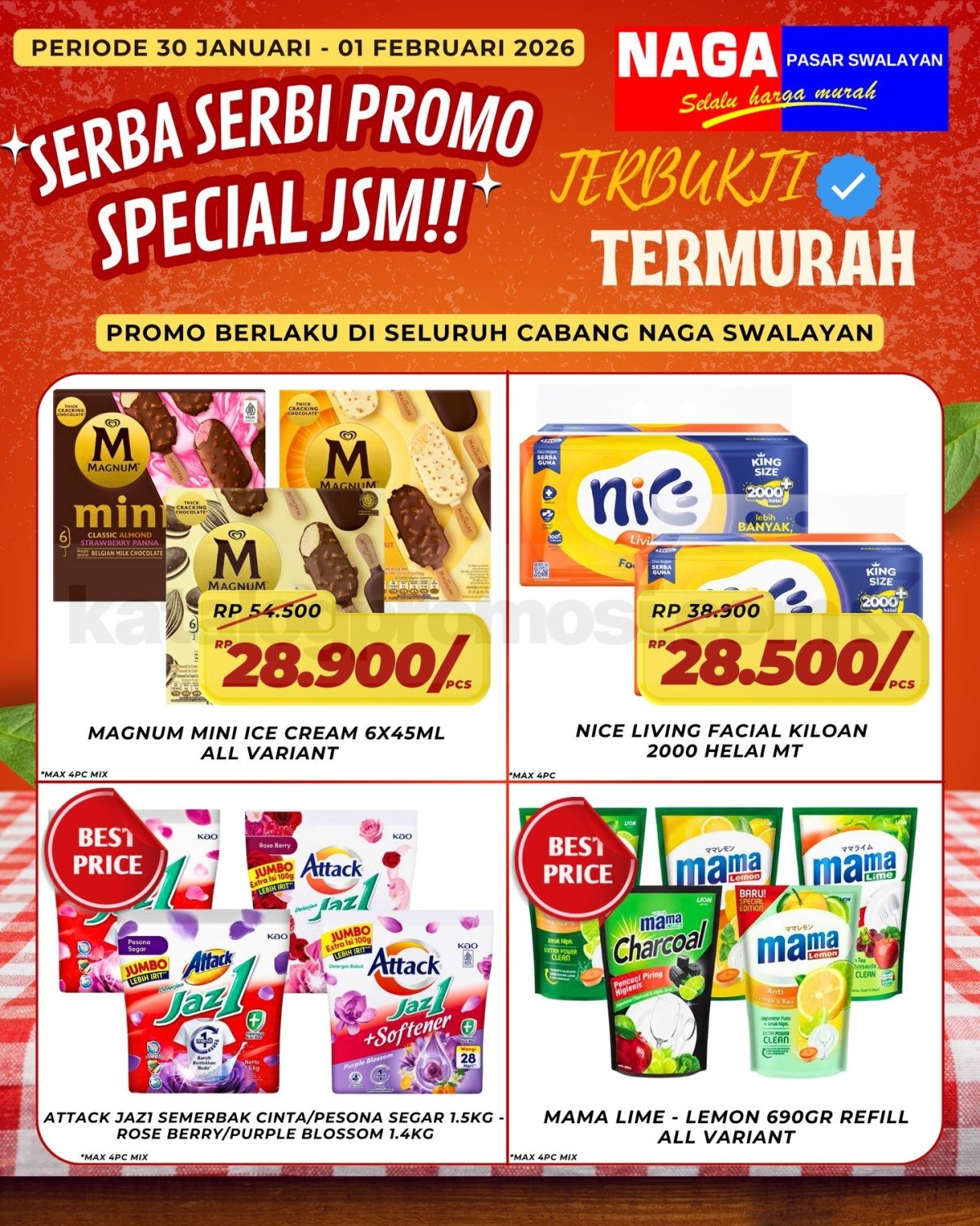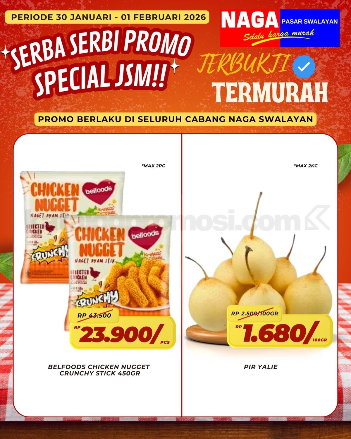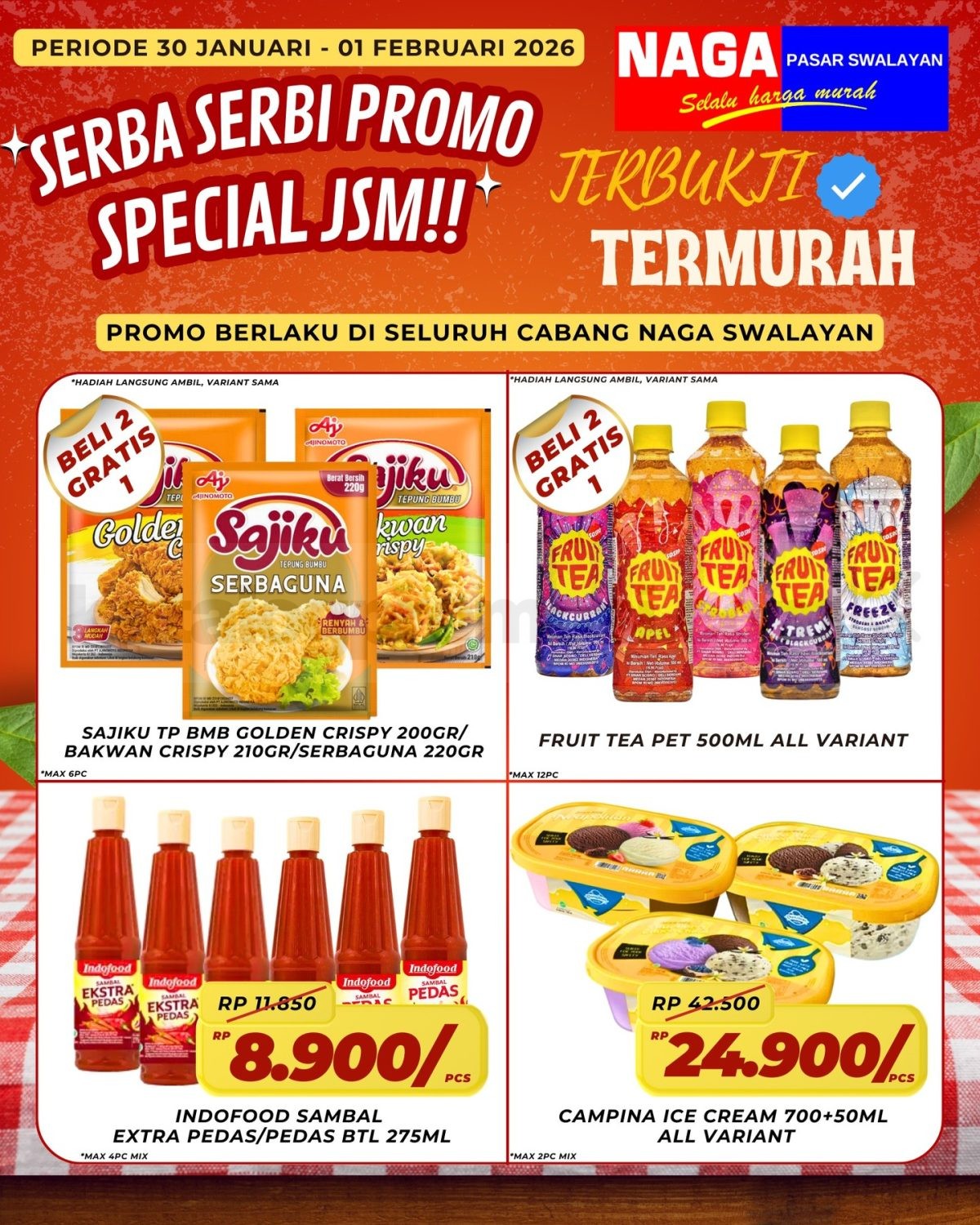 Promo berlaku di seluruh cabang Naga Swalayan pada periode 30 Januari – 01 Februari 2026