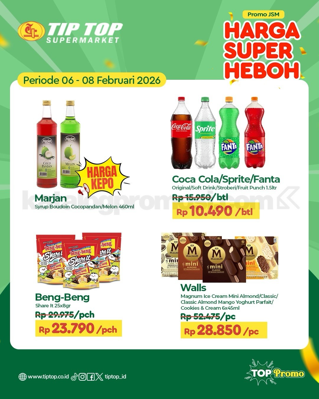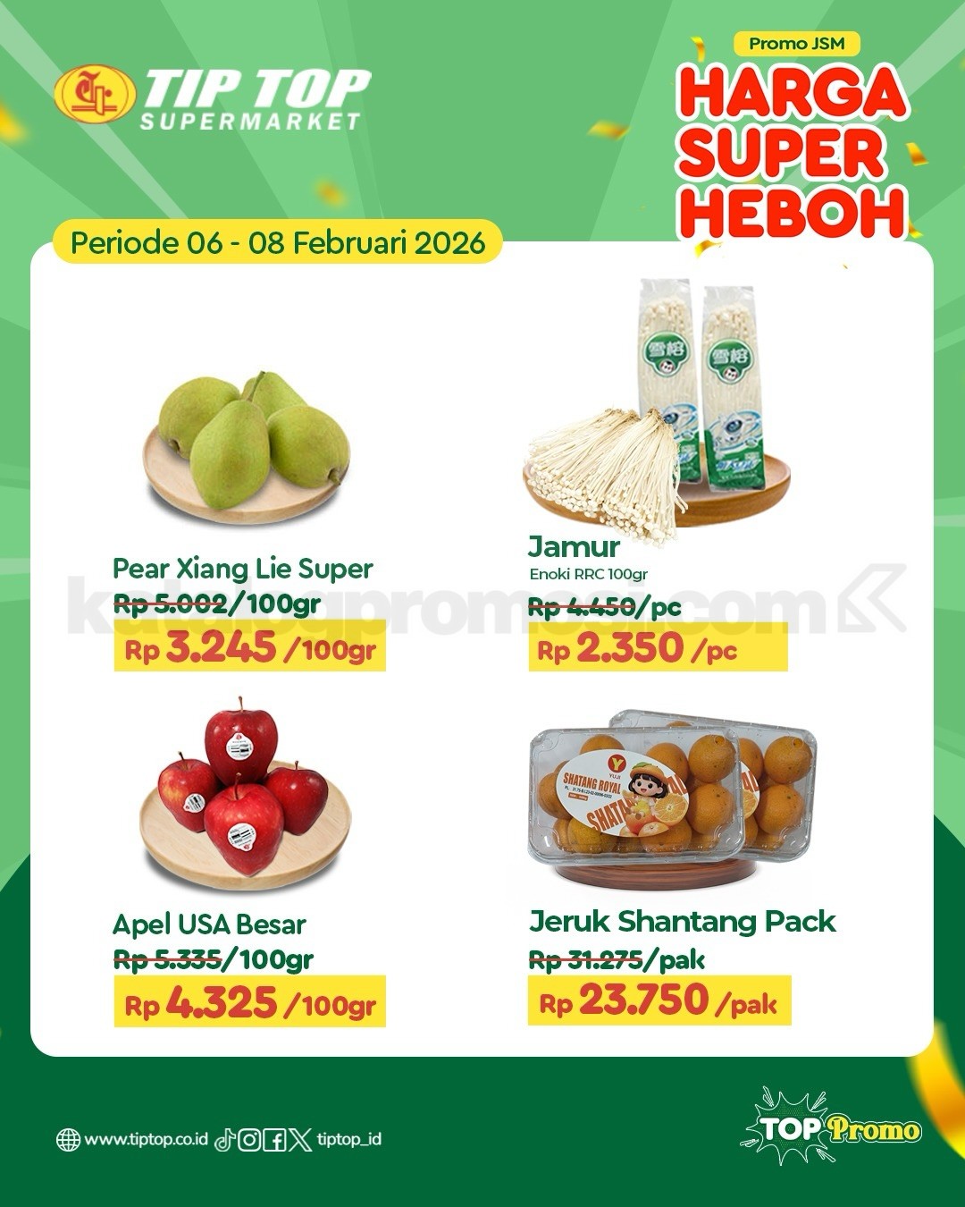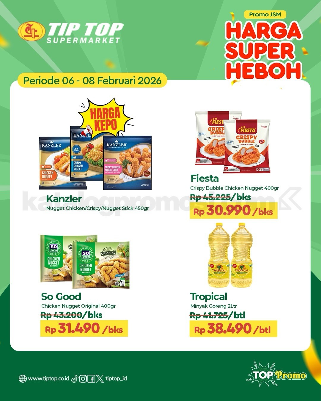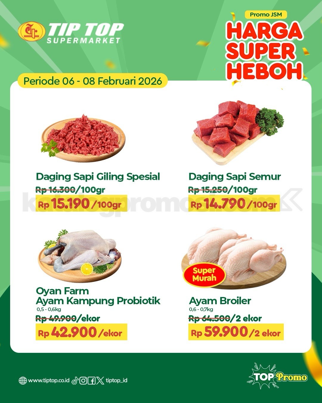 Belanja kebutuhan harian dengan harga spesial di Promo JSM TIP TOP Supermarket! Cek langsung penawaran terbaik dari 06-08 Februari 2026 untuk berbagai produk unggulan dengan Harga Super Heboh. Dari kebutuhan dapur hingga keperluan rumah tangga, semuanya tersedia di TIP TOP Supermarket. Pas banget buat belanja hemat dan praktis di akhir pekan! 😍
