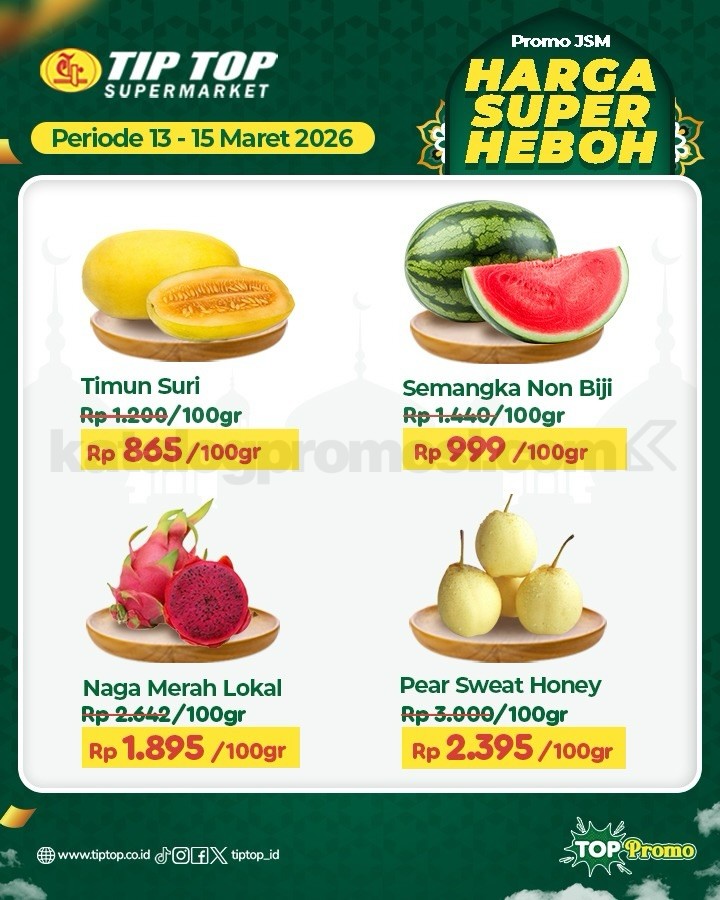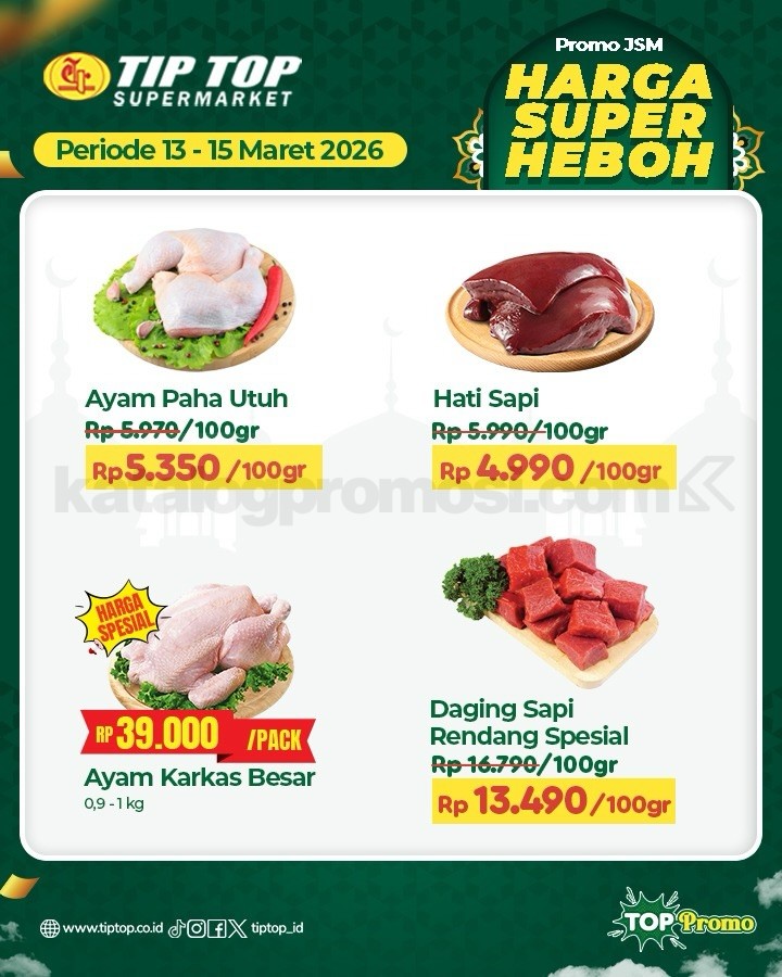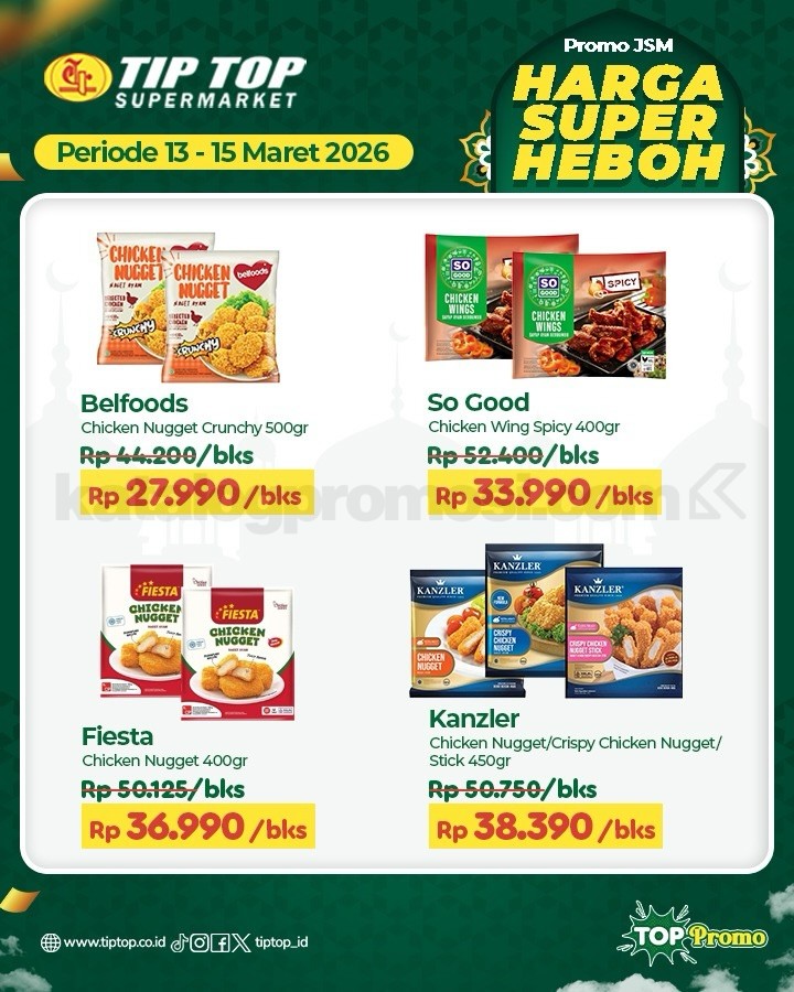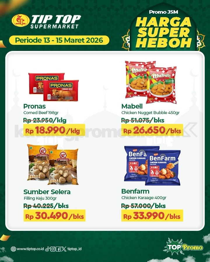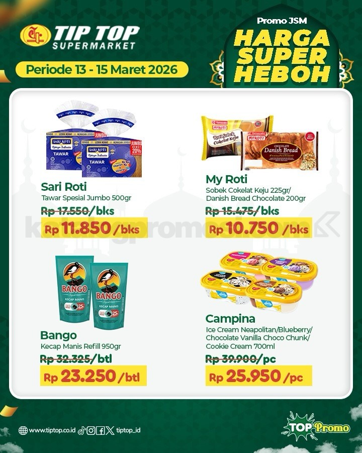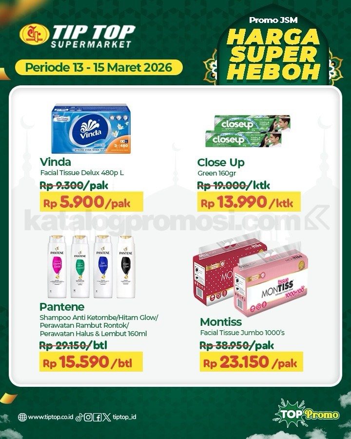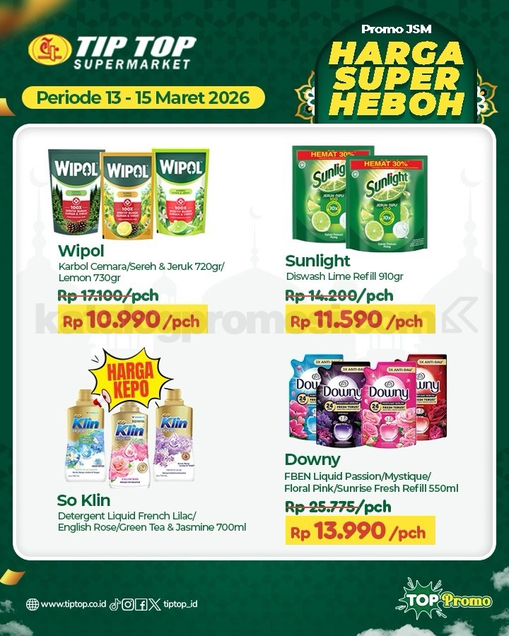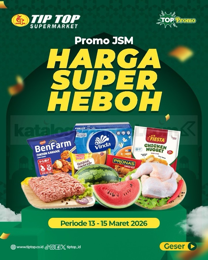 Belanja kebutuhan harian dengan harga spesial di Promo JSM TIP TOP Supermarket! Cek langsung penawaran terbaik dari 13-15 Maret 2026 untuk berbagai produk unggulan dengan Harga Super Heboh. Dari kebutuhan dapur hingga keperluan rumah tangga, semuanya tersedia di TIP TOP Supermarket. Pas banget buat belanja hemat dan praktis di akhir pekan! 😍