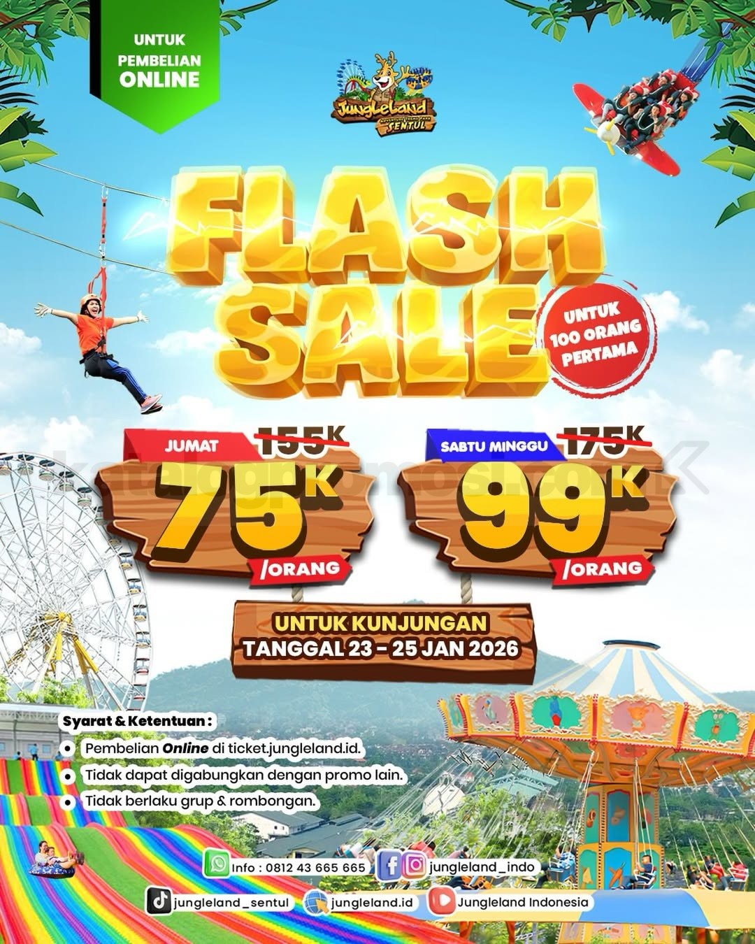Promo Jungleland Flash Sale Tiket Wahana mulai Rp. 75.000, beli tiket via website resmi, berlaku mulai tanggal 22 Januari 2026 – 24 Januari 2026.