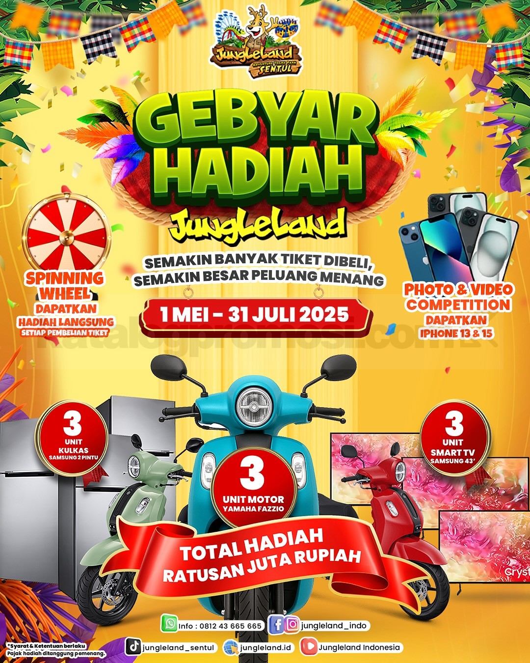 Promo Jungleland Gebyar Hadiah berhadiah motor, kulkas, TV, hingga iPhone 15! Setiap pembelian tiket langsung dapat kupon undian & kesempatan hadiah instan. Berlaku sampai 31 Juli 2025!