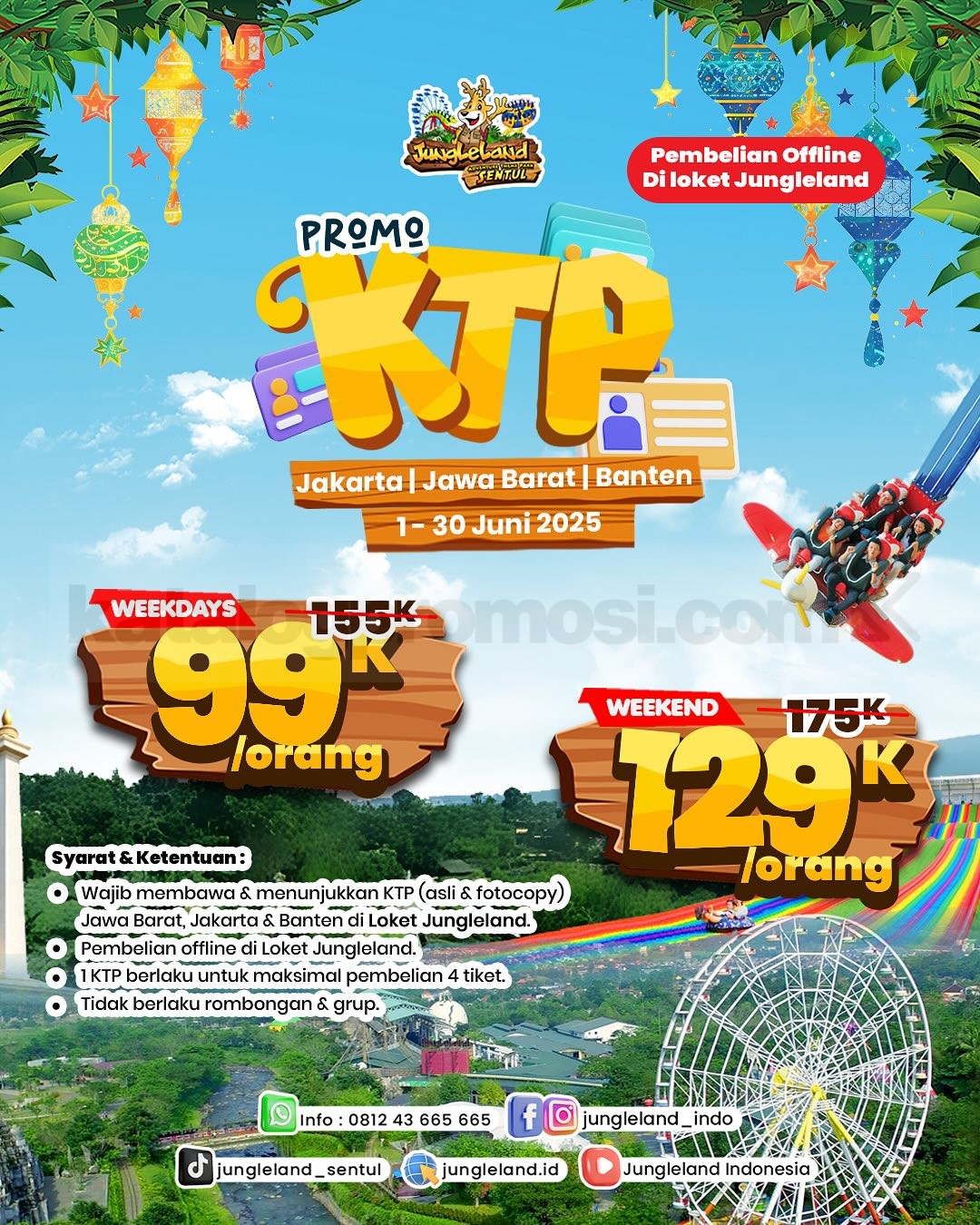 PROMO JUNGLELAND HARGA SPESIAL TIKET MASUK buat kamu yang punya KTP Jakarta, Jawa Barat, atau Banten! Cukup tunjukin KTP (asli atau fotokopi) langsung di loket Jungleland, kamu bisa liburan dengan hemat: