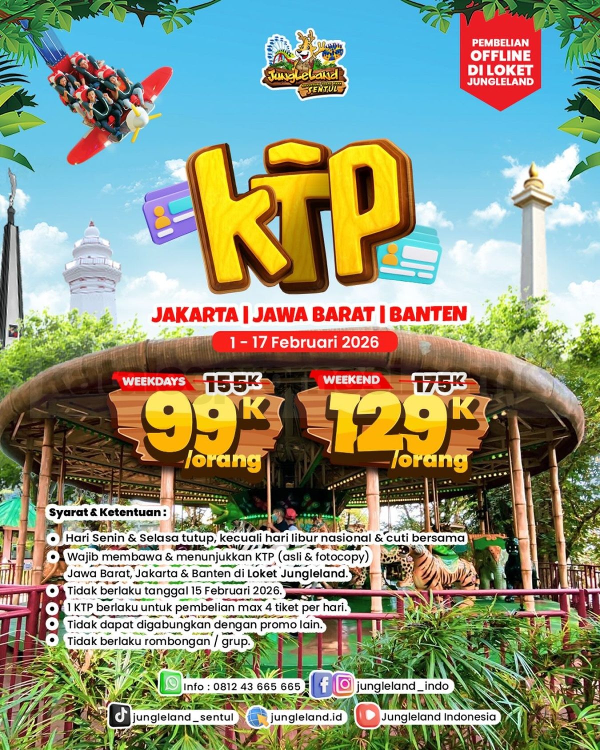 Promo JungleLand Harga Spesial Tiket Masuk KTP Jakarta, Jabar, Banten berlaku 1 – 17 Februari 2026 dengan pembelian langsung di loket JungleLand.