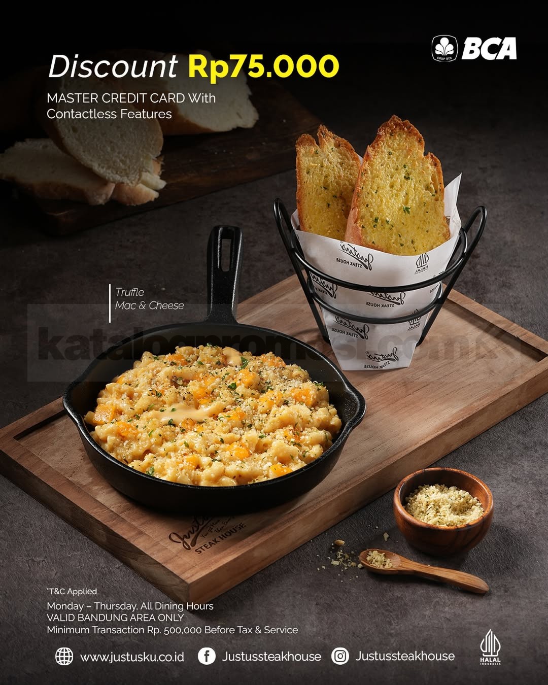 Promo Justus Steakhouse BCA Diskon Rp. 75.000 potongan transaksi minimal Rp 500.000 bayar BCA Mastercard berlaku Senin – Kamis di Bandung