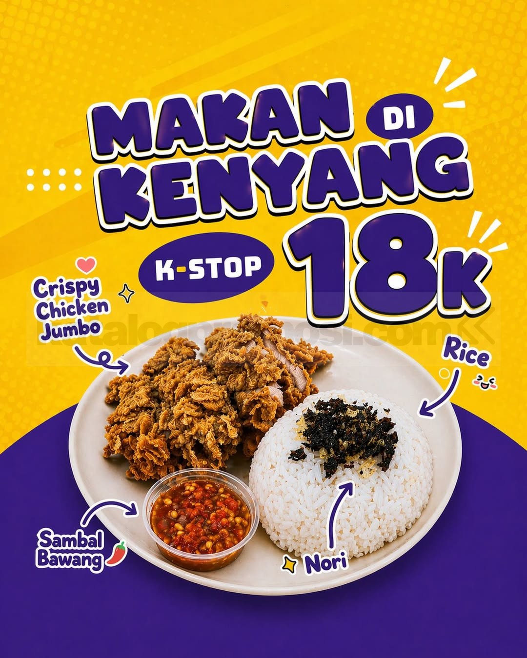 Makan kenyang di K-STOP cuma Rp. 18.000? Beneran ada! π Menu Crispy Chicken Jumbo ini lagi jadi andalan banget, apalagi di tanggal tua. Dengan porsi jumbo yang bikin puas, kamu sudah dapat ayam krispi fillet yang juicy, lengkap dengan nasi hangat, taburan nori, dan sambal bawang yang pedasnya nampol.