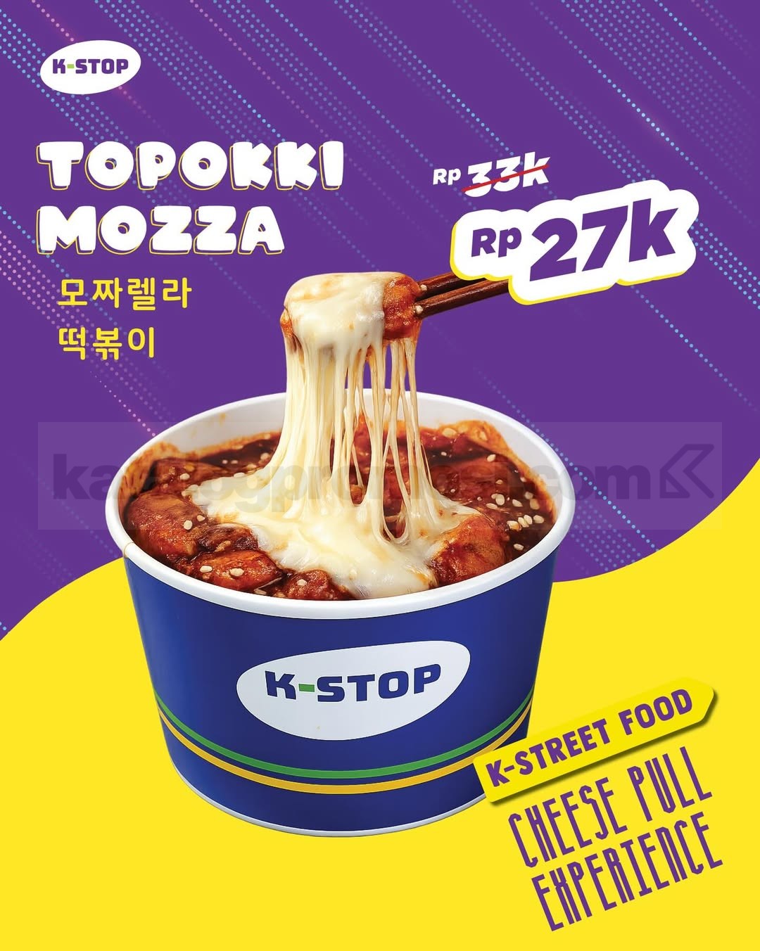 Promo K-STOP Topokki Mozza Rp. 27.000 dengan keju melimpah dan saus pedas nikmat, pembelian langsung di outlet berlaku selama promo tersedia di lokasi tertentu