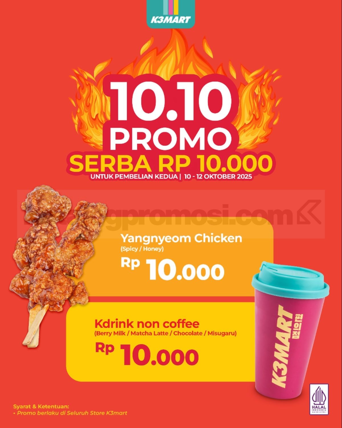 Promo K3MART 10.10 Serba RP10.000 mulai dari Yangnyeom Chicke dan Kdrink Non-Coffee, Berlaku mulai tanggal 10-12 Oktober 2025.