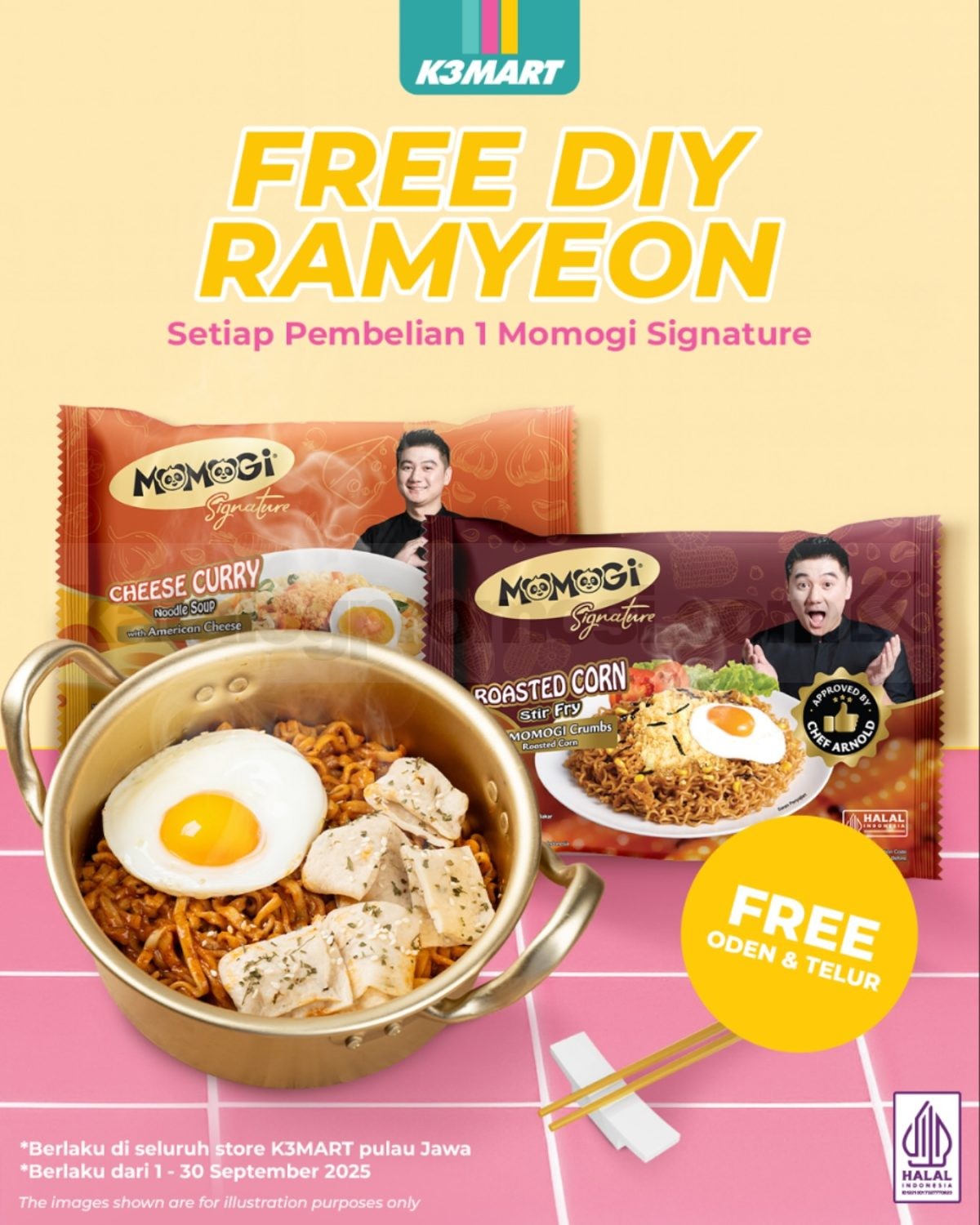 Kapan lagi bisa dapet topping lezat buat DIY ramyeon kamu cuma dengan beli Momogi Signature? Promo ini juga berlaku sepanjang 1β30 September 2025, jadi jangan sampe kelewatan yaa! Cuss langsung gas ke K3MART terdekat dan nikmati keseruan DIY ramyeon tanpa harus keluar budget ekstra buat topping! ππ₯