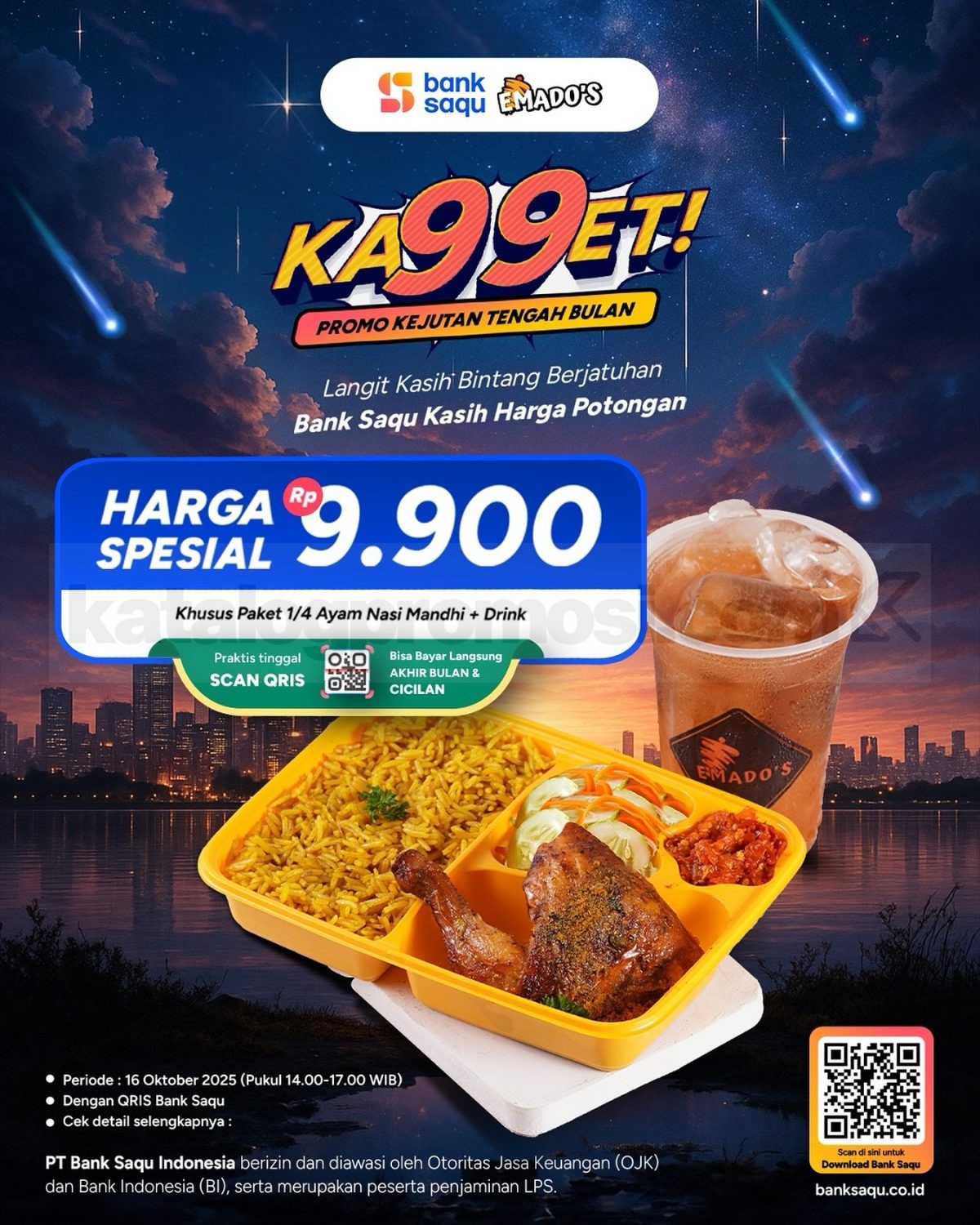 Promo KA99ET Bank Saqu hadir di Emados! Paket 1/4 Ekor Ayam Nasi Mandhi + Free Drink cuma Rp9.900, berlaku 16 Oktober 2025.