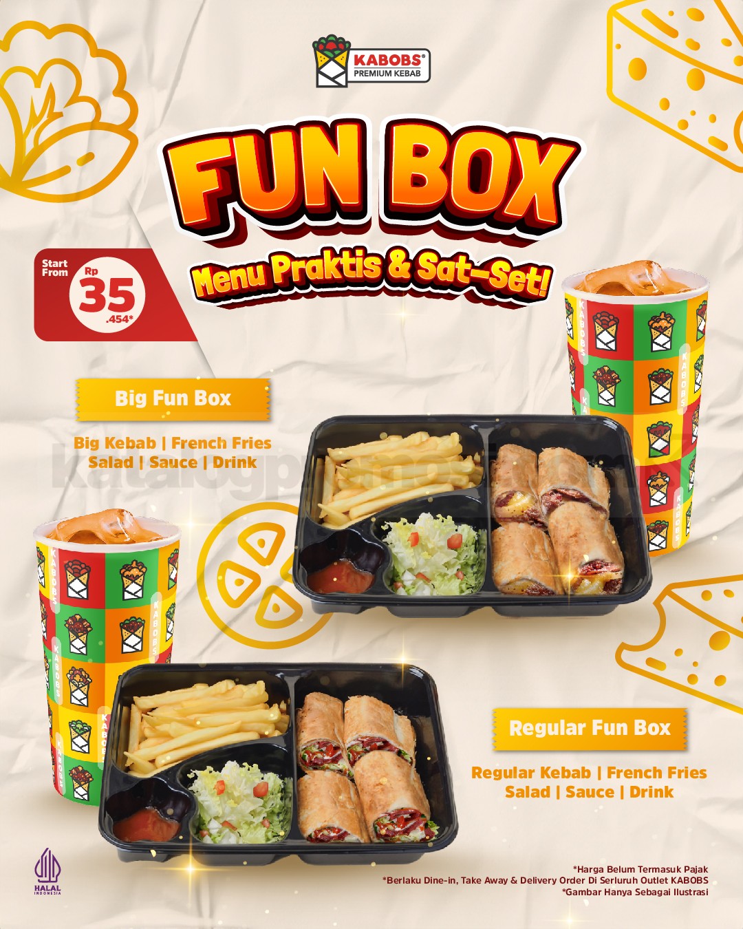 - Regular Fun Box → Regular Kebab + French Fries + Salad + Sauce + Drink → mulai Rp. 35.454
