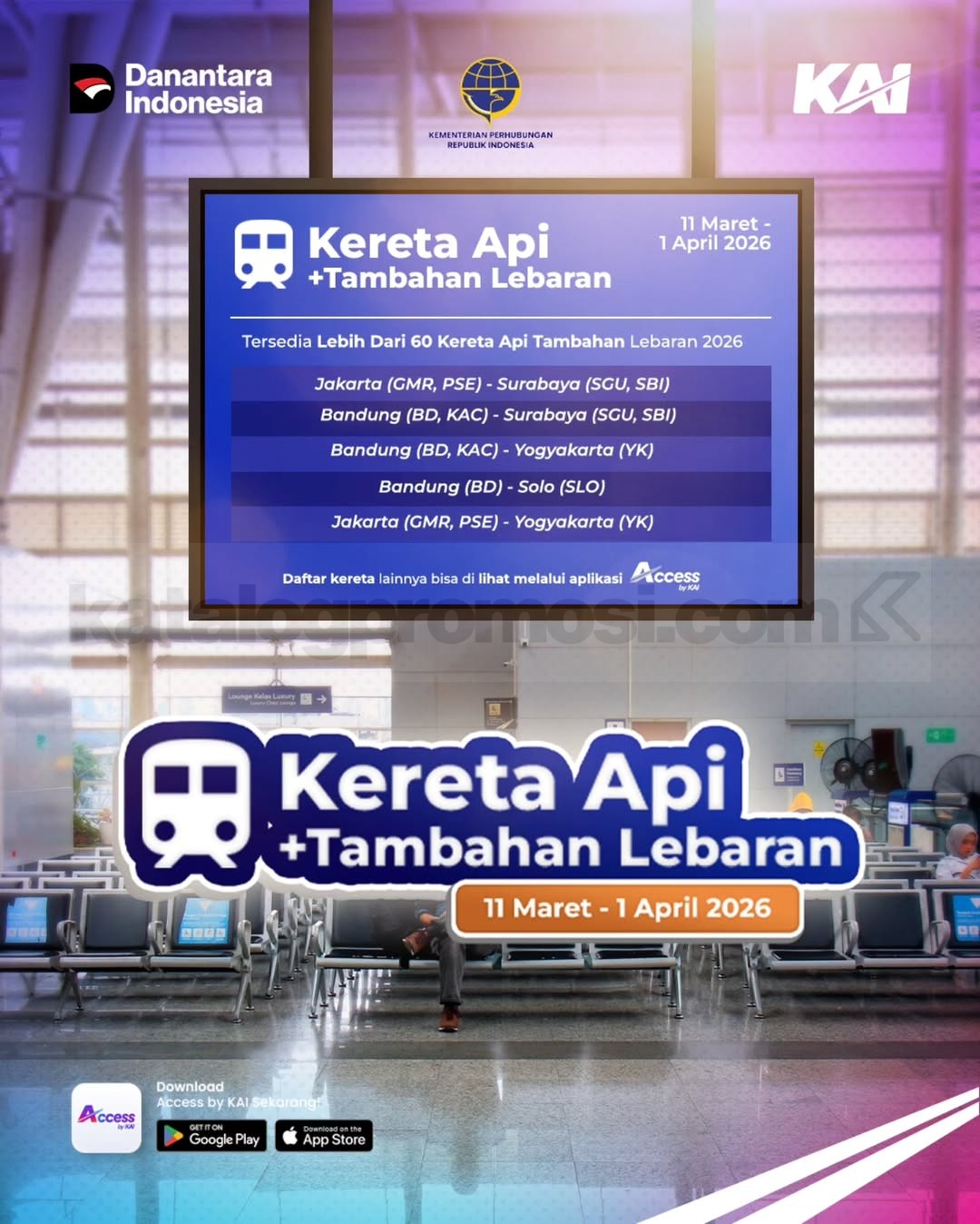 Promo KAI Diskon 30% Kereta Ekonomi Lebaran potongan 30% untuk keberangkatan 14–29 Maret 2026, berlaku mulai tanggal 10 Februari 2026 – 29 Maret 2026 via channel resmi KAI.