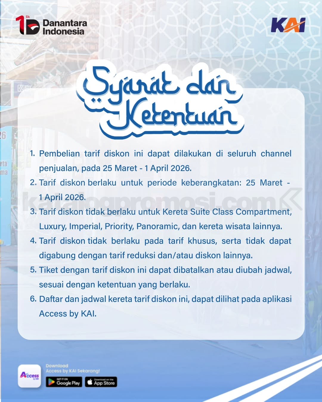 Pembelian tiket promo ini dilakukan melalui aplikasi Access by KAI, sehingga kamu bisa lebih praktis dalam memilih jadwal, rute, hingga kursi perjalanan. Selain itu, tiket dengan tarif diskon ini tetap dapat dibatalkan atau diubah jadwal sesuai ketentuan yang berlaku.