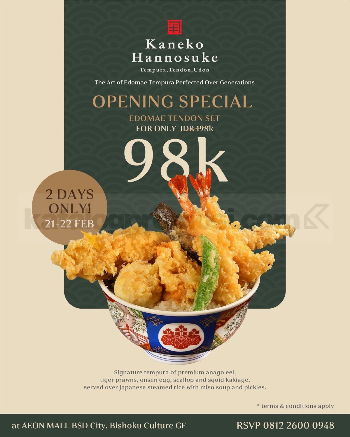 Promo Kaneko Hannosuke Opening Beli Tendon Rp. 98.000 periode 21 – 22 Februari 2026 di AEON Mall BSD City minimum transaksi Rp. 350.000.
