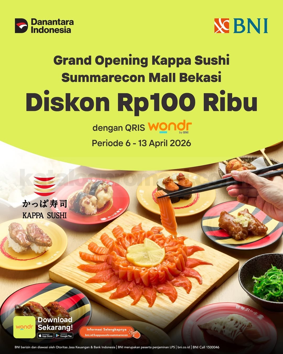 Promo ini berlaku mulai 6 April 2026 hingga 13 April 2026 dan hanya tersedia di Kappa Sushi Summarecon Mall Bekasi. Tapi perlu diingat, promo ini terbatas hanya untuk 100 orang pertama selama periode berlangsung, jadi siapa cepat dia dapat.