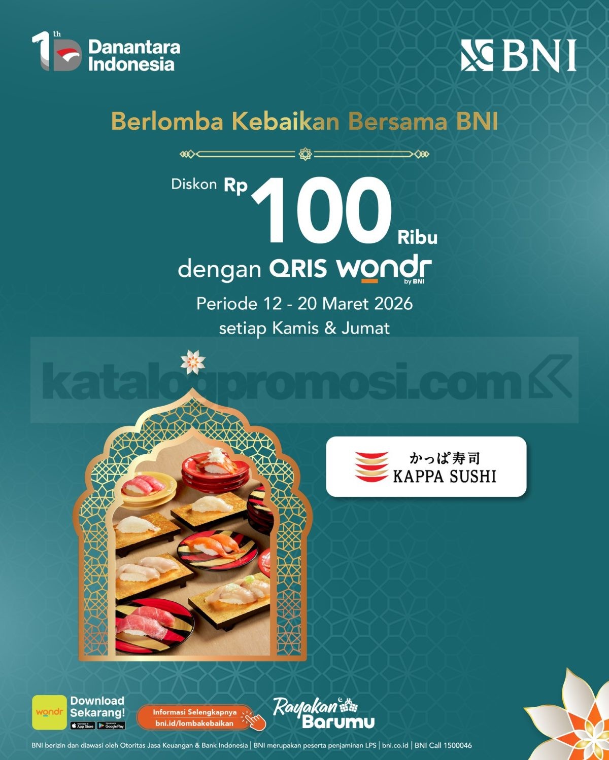Promo Kappa Sushi BNI Ramadan Buffet Diskon Rp. 100.000 dengan pembayaran QRIS wondr by BNI, minimum transaksi Rp750.000 berlaku mulai tanggal 12-20 Maret 2026 di seluruh outlet.
