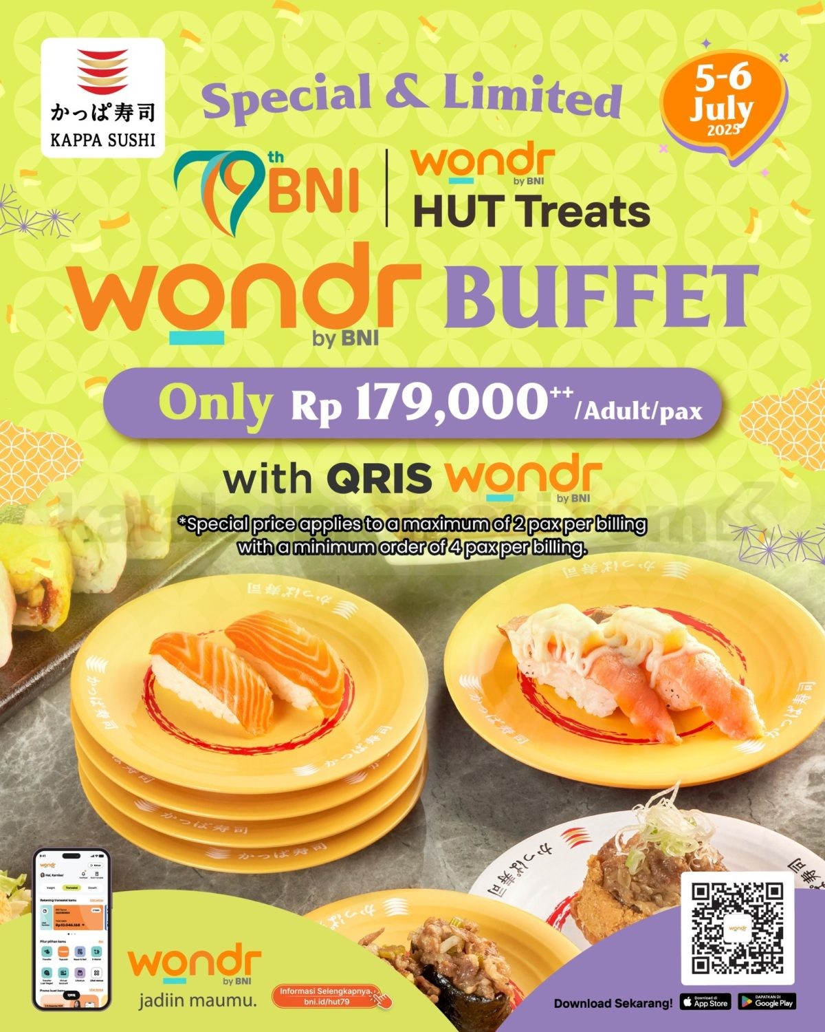 Promo Kappa Sushi Merdeka dengan QRIS Wondr by BNI potongan Rp80.000 untuk transaksi minimal Rp800.000 sebelum pajak dan layanan, berlaku 17–18 Agustus 2025 di semua outlet Kappa Sushi Indonesia.