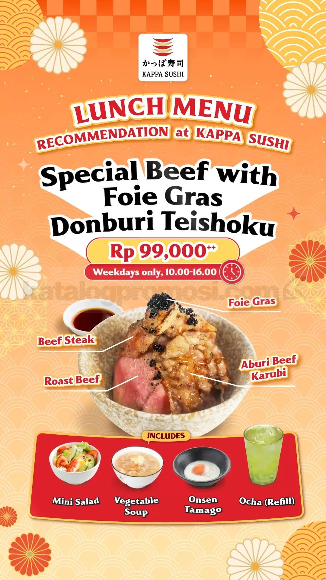 Makan siang mewah tapi hemat? Bisa banget! Kappa Sushi punya menu Special Beef with Foie Gras Donburi Teishoku cuma Rp99.000++ aja!