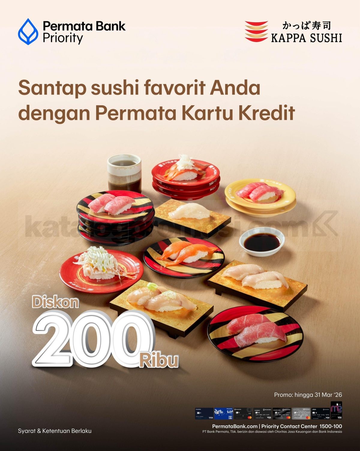 Promo Kappa Sushi x Permata Kartu Kredit diskon Rp200 ribu setiap SabtuโMinggu dengan transaksi min. Rp1 juta, berlaku hingga 31 Maret 2026.