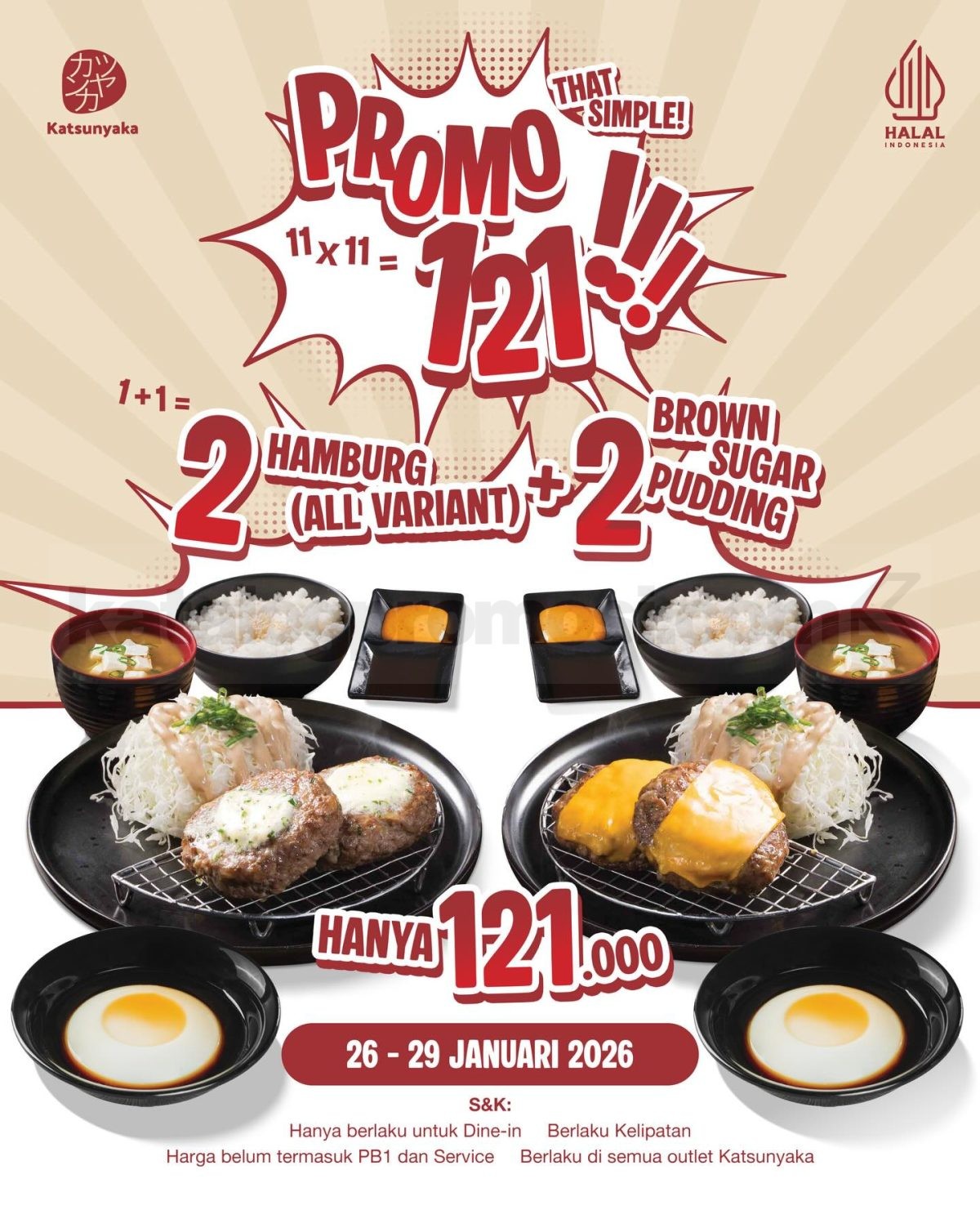 Promo Katsunyaka 121 Hamburg Set Rp. 121.000 menawarkan paket makan berisi 2 Hamburg Set all variant dan 2 Brown Sugar Pudding, berlaku mulai tanggal 26-29 Januari 2026 di seluruh outlet Katsunyaka.