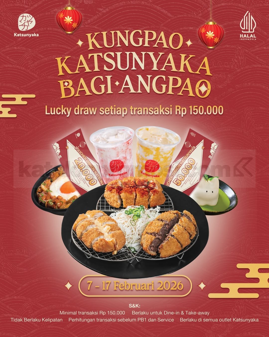 Promo Katsunyaka Bagi-Bagi Angpao dengan minimal transaksi Rp. 150.000 kesempatan bawa angpao berlaku mulai tanggal 7 Februari 2026 – 17 Februari 2026 di seluruh outlet