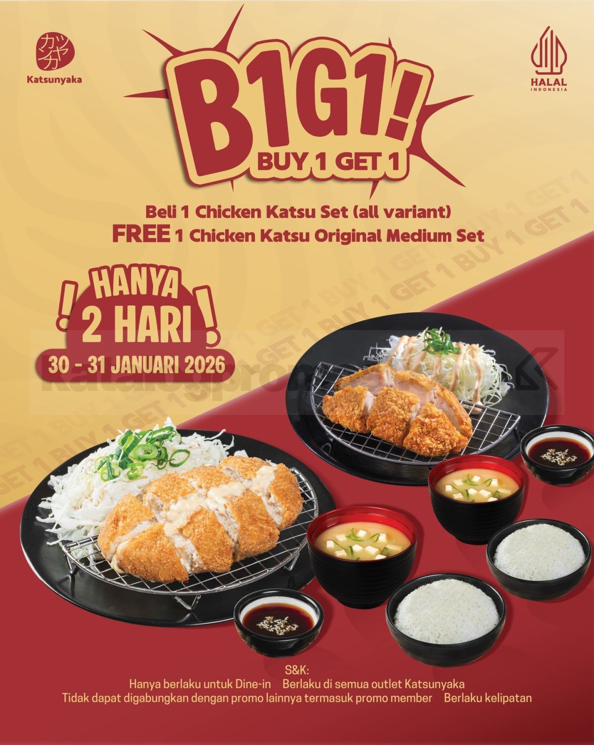 Promo Katsunyaka Buy 1 Get 1 Chicken Katsu Set gratis beli 1 semua varian dapat 1 Chicken Katsu Original Medium Set, berlaku 30 Januari 2026 – 31 Januari 2026 di seluruh outlet.
