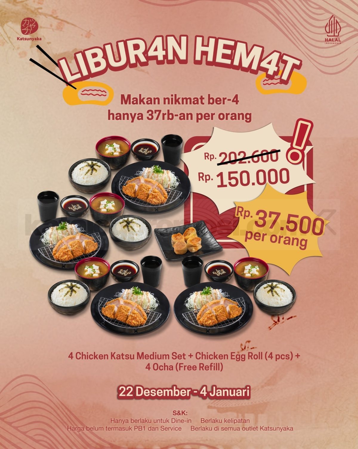 Promo Katsunyaka LIBUR4N HEM4T Rp. 150.000 dengan paket makan berempat lengkap. Berlaku mulai tanggal 22 Desember 2025 – 4 Januari 2026 di seluruh outlet.