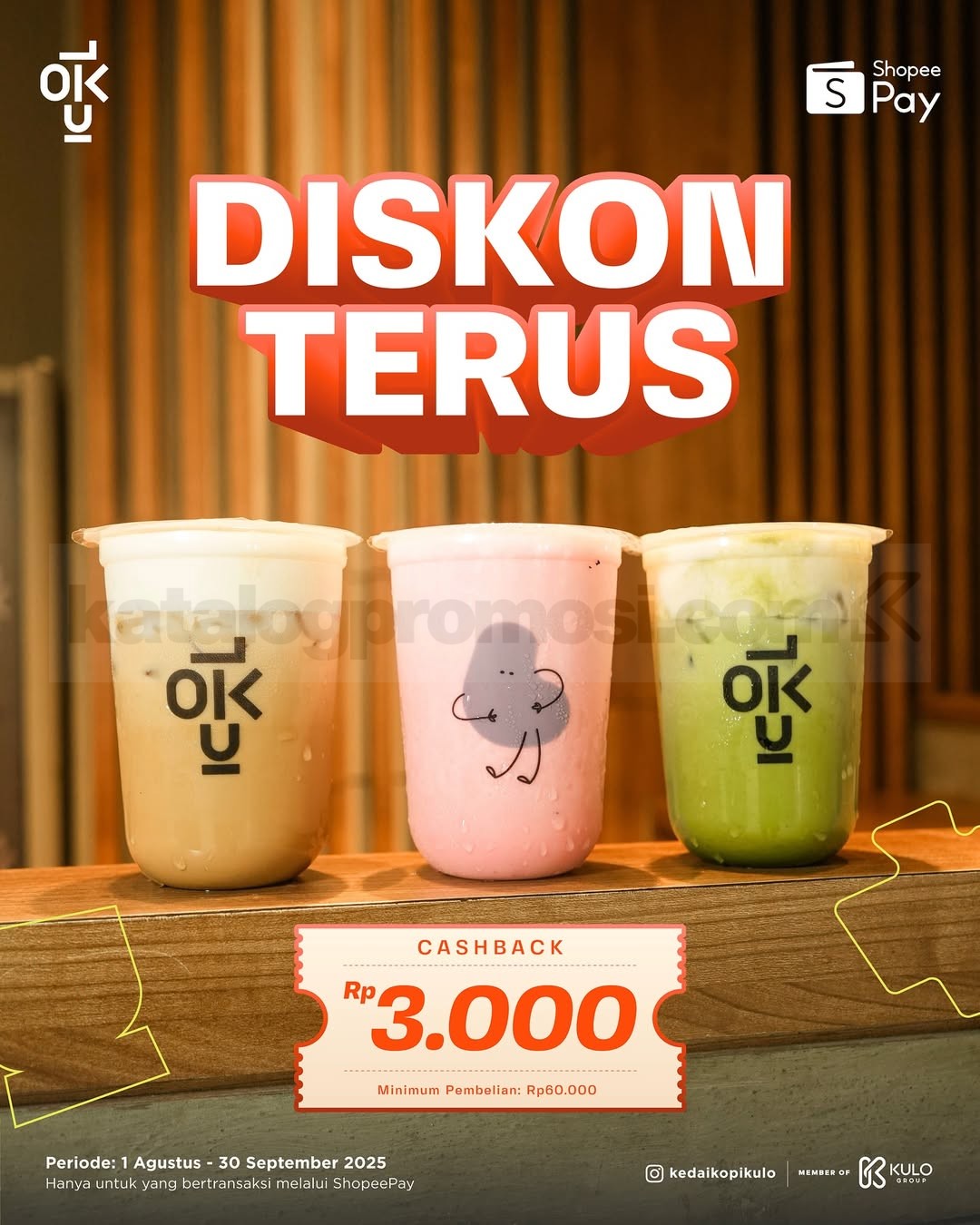 Promo ShopeePay Cashback di Kedai Kopi Kulo! Dapatkan cashback Rp3.000 setiap transaksi min. Rp60.000. Berlaku sampai 30 Sept 2025!