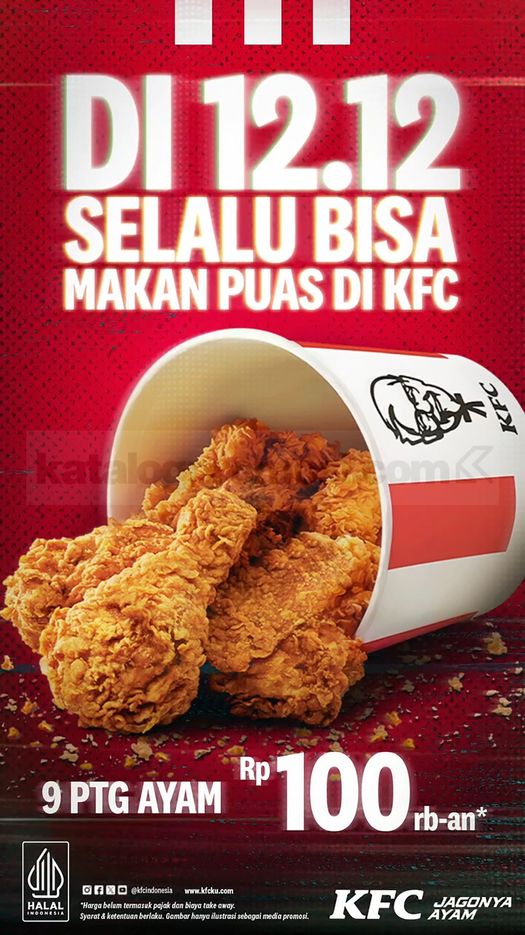 Momen tanggal kembar jadi makin seru bareng promo spesial KFC 12.12. Nikmati 9 potong Whole Chicken mulai dari Rp. 100.000* — pilihan pas buat makan ramean bareng keluarga, sahabat, atau doi tersayang. ❤️