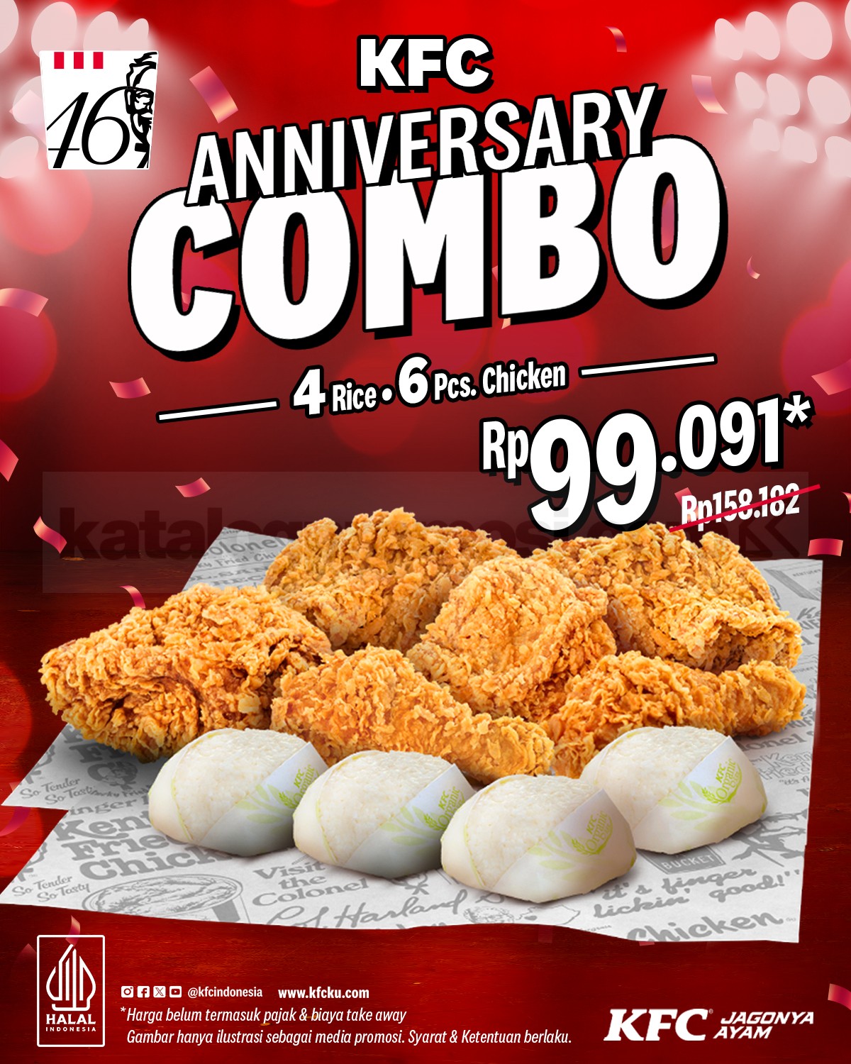 Promo KFC 46th Anniversary Combo 6 Chicken + 4 Rice harga Rp. 99.091 berlaku 13โ24 Oktober 2025 di seluruh store KFC Indonesia.