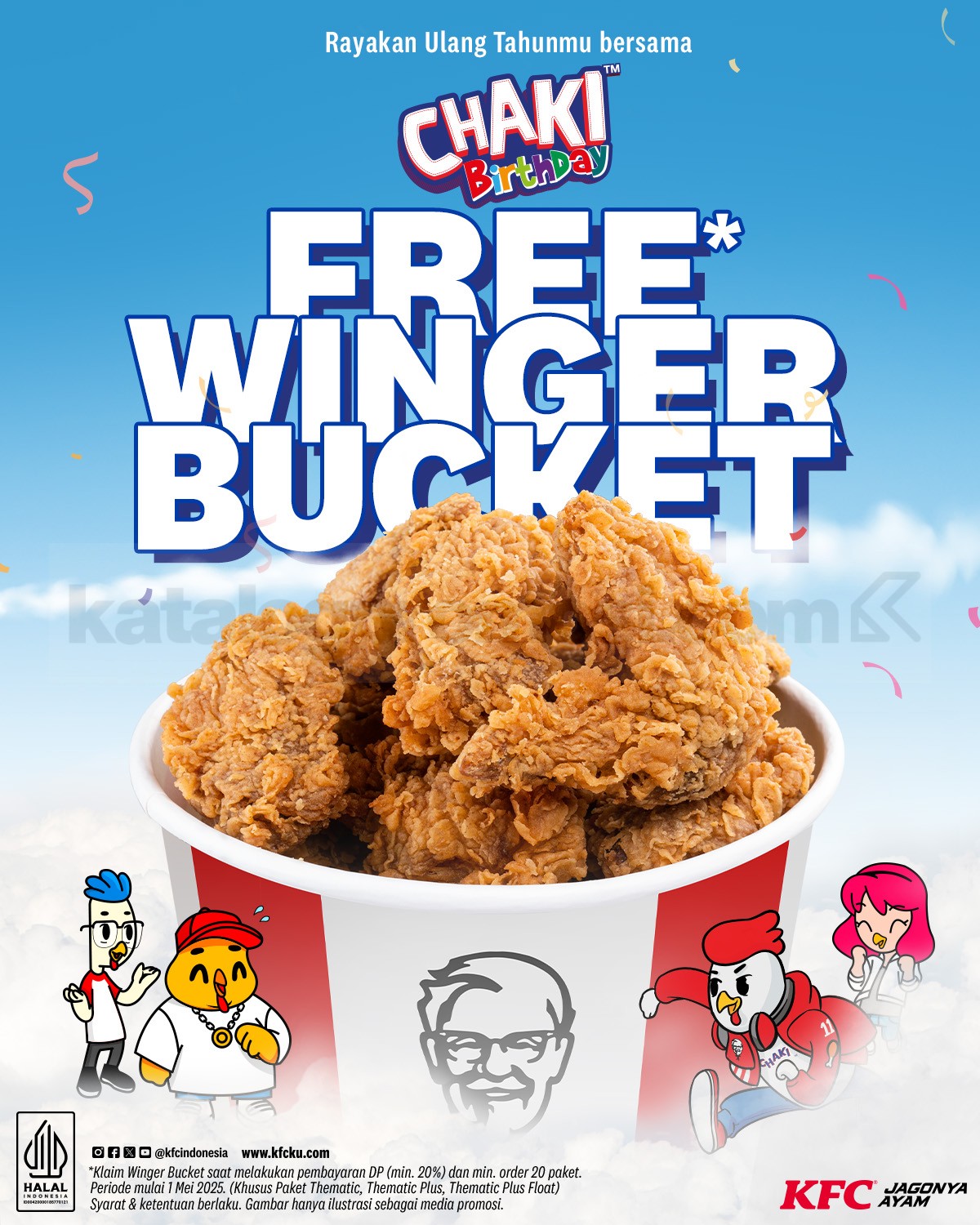 Mulai 1 Mei 2025, kamu bisa dapat FREE Winger Bucket atau 5 pcs Chicken saat melakukan pembayaran DP minimal 20% untuk pemesanan ulang tahun di seluruh store Birthday Nasional KFC.