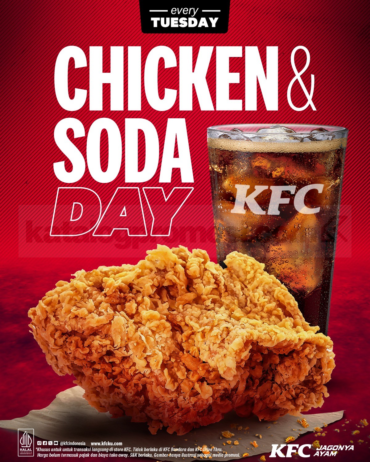 Setiap hari Selasa sekarang makin seru bareng KFC! Ada promo spesial Chicken Free Soda yang bikin kamu bisa nikmati 1 potong ayam crispy favorit lengkap dengan soft drink medium GRATIS 🎉