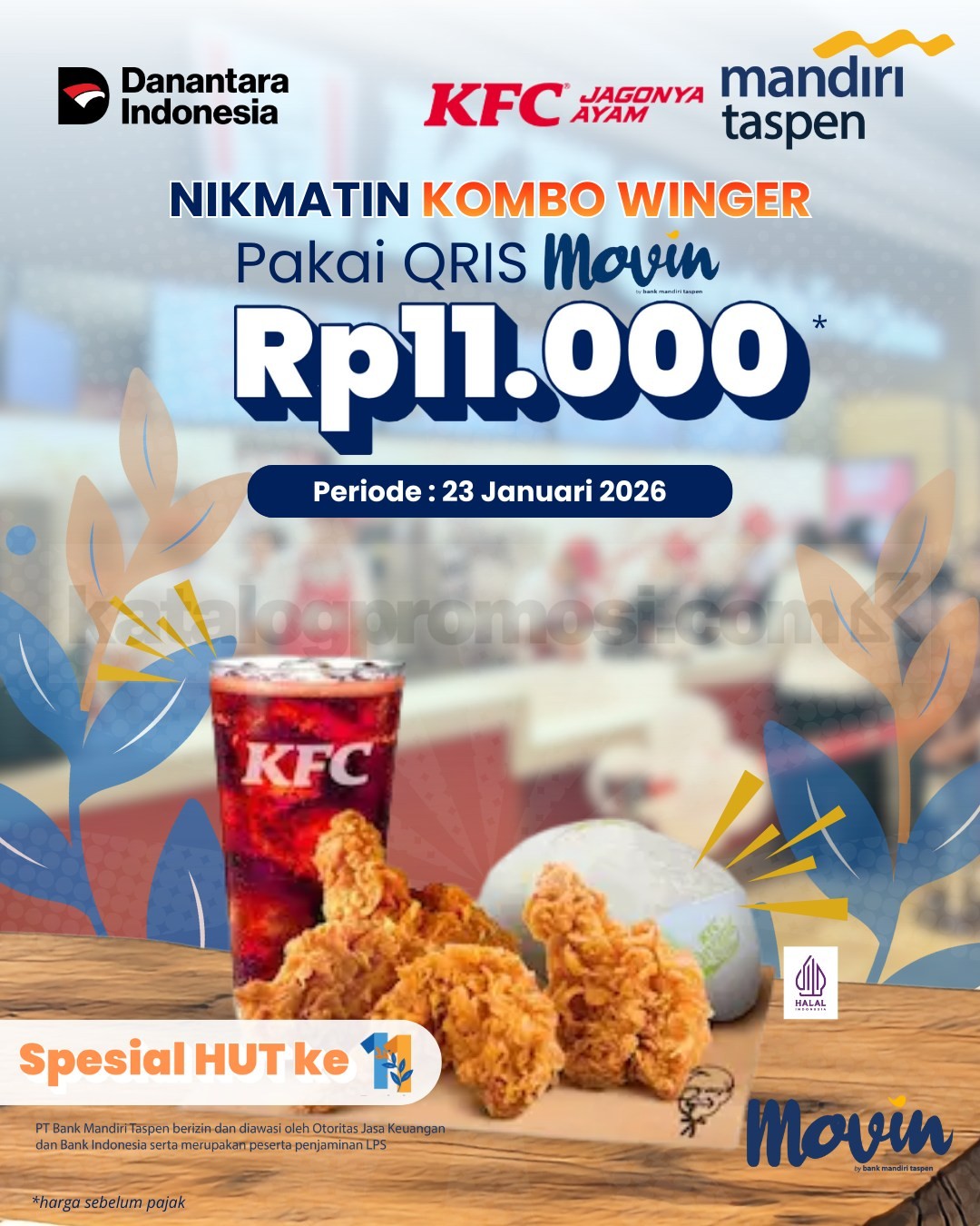 Promo KFC HUT Mandiri Taspen Kombo Winger Rp. 11.000 berlaku hanya di tanggal 23 Januari 2026, bayar pakai QRIS Movin di outlet KFC tertentu.