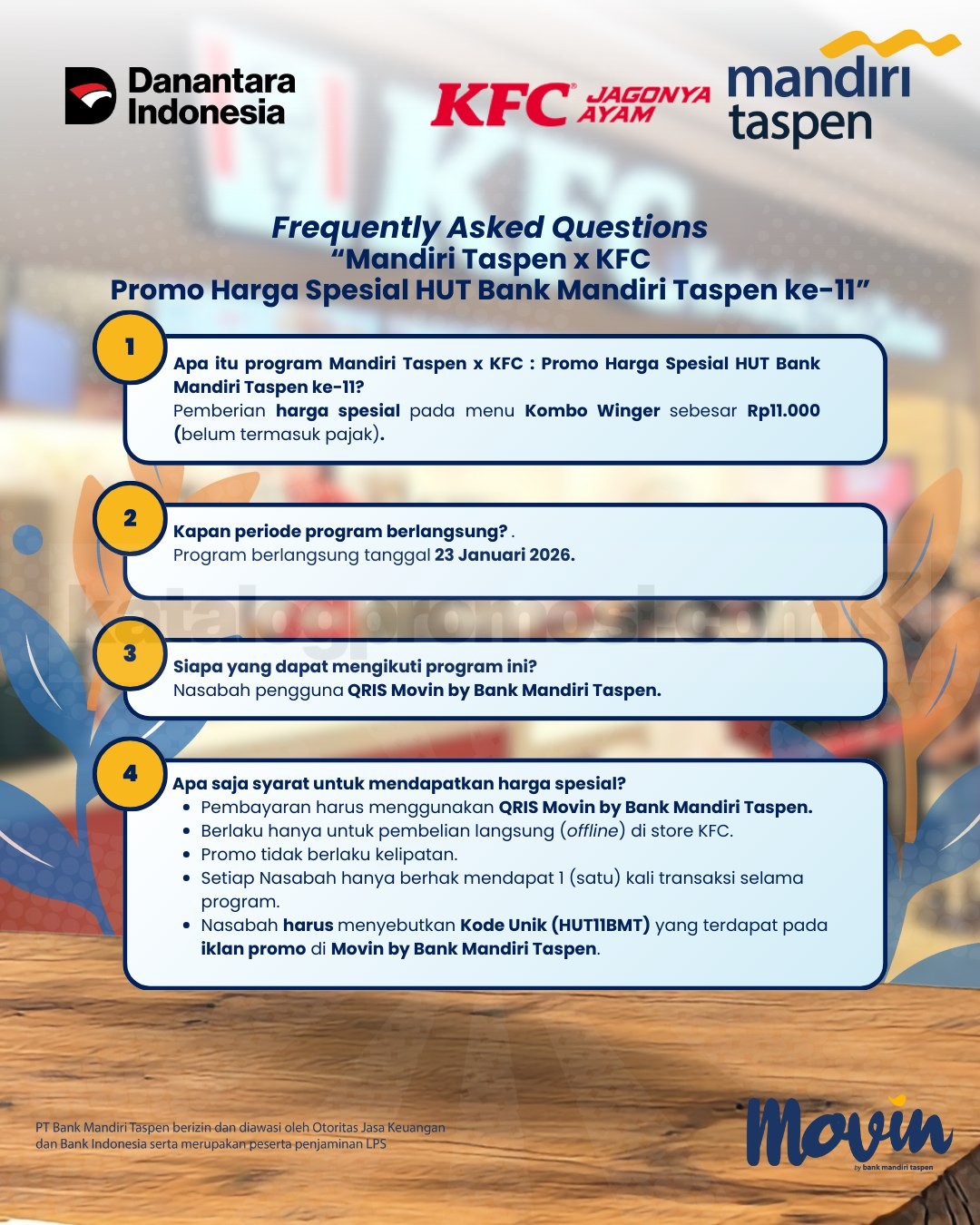 Kalau lagi cari makan praktis dengan harga super hemat, promo KFC bareng Bank Mandiri Taspen ini layak langsung dicatat. Datang di tanggalnya, pakai QRIS Movin, dan nikmati Kombo Winger tanpa mikir panjang.