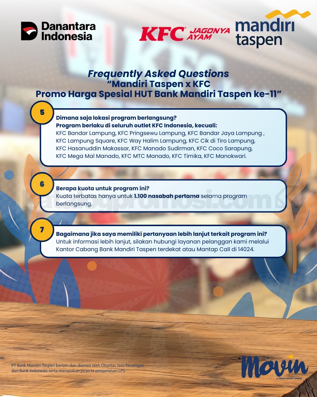 👉 Cek gambar Promo KFC HUT Mandiri Taspen Kombo Winger Rp. 11.000 di bawah ini untuk lihat detail menu, syarat, dan info pembayaran QRIS Movin.