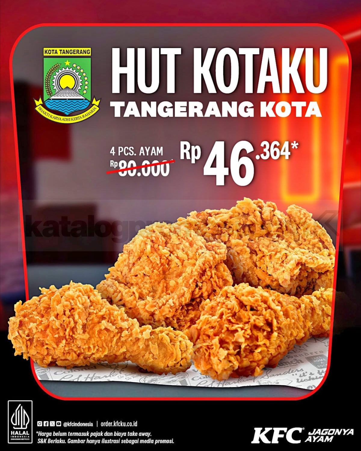 Promo KFC HUT Tangerang Kota 4 Pcs Ayam Rp. 46.364 periode 27 – 28 Februari & 1 Maret 2026 khusus outlet KFC wilayah Tangerang Kota, belum termasuk pajak dan biaya takeaway.