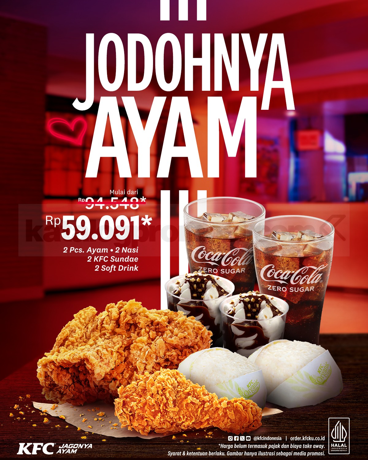 Promo KFC Jodohnya Ayam Berdua mulai Rp. 59.091, dapat 2 ayam, 2 nasi, 2 sundae, dan 2 soft drink, berlaku 2 – 14 Februari 2026 di seluruh gerai KFC Indonesia.