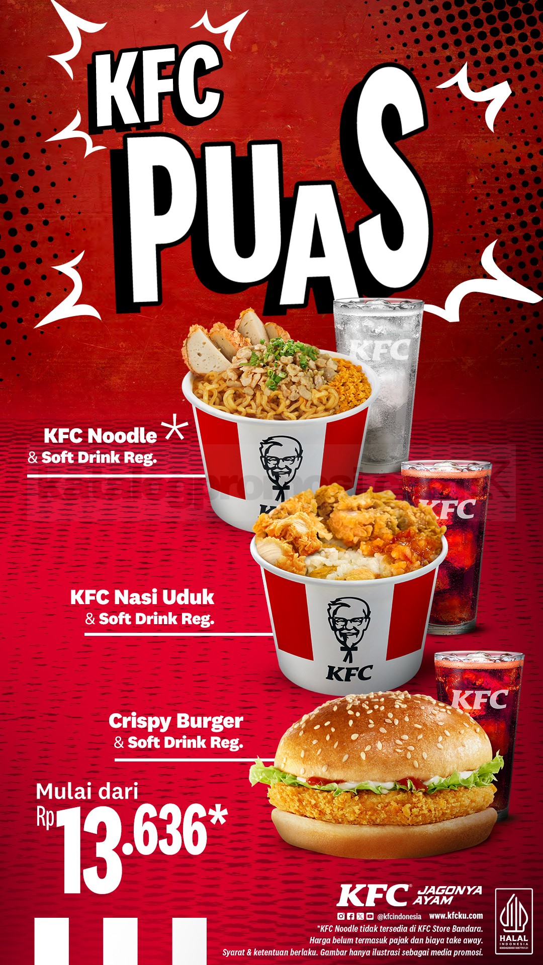 Promo KFC PUAS mulai Rp13.636! Pilih Noodle, Nasi Uduk, atau Crispy Burger + Soft Drink. Berlaku di seluruh outlet KFC