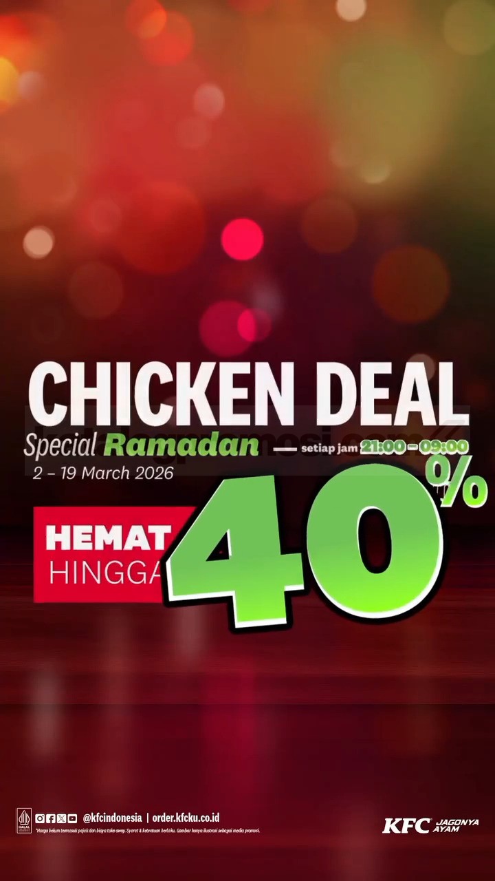 Promo KFC Ramadan Chicken Deal Diskon hingga 40% berlangsung pada 2 – 19 Maret 2026 dan tersedia melalui berbagai metode pembelian seperti dine in, takeaway, drive thru, serta melalui aplikasi KFCku.