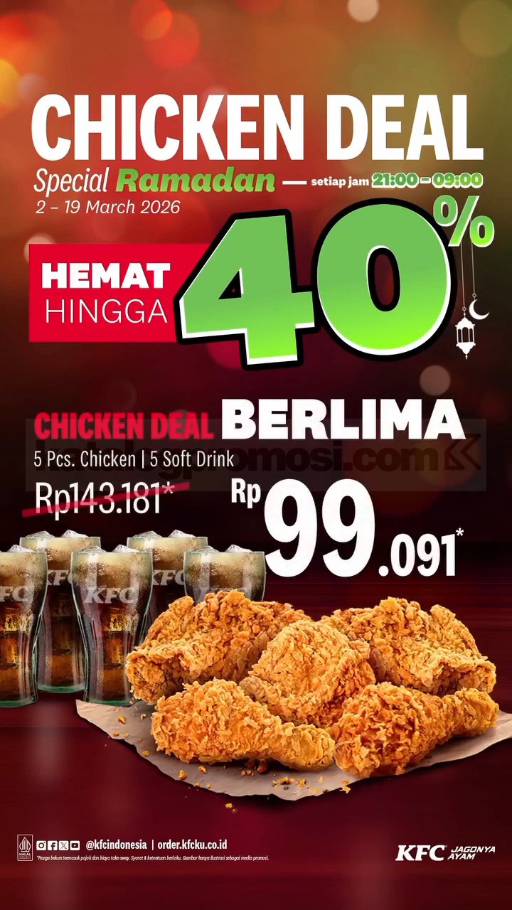 Promo KFC Ramadan Chicken Deal diskon hingga 40% periode 2 – 19 Maret 2026 setiap pukul 21.00 – 09.00 melalui dine in, takeaway, drive thru, dan KFCku Apps.