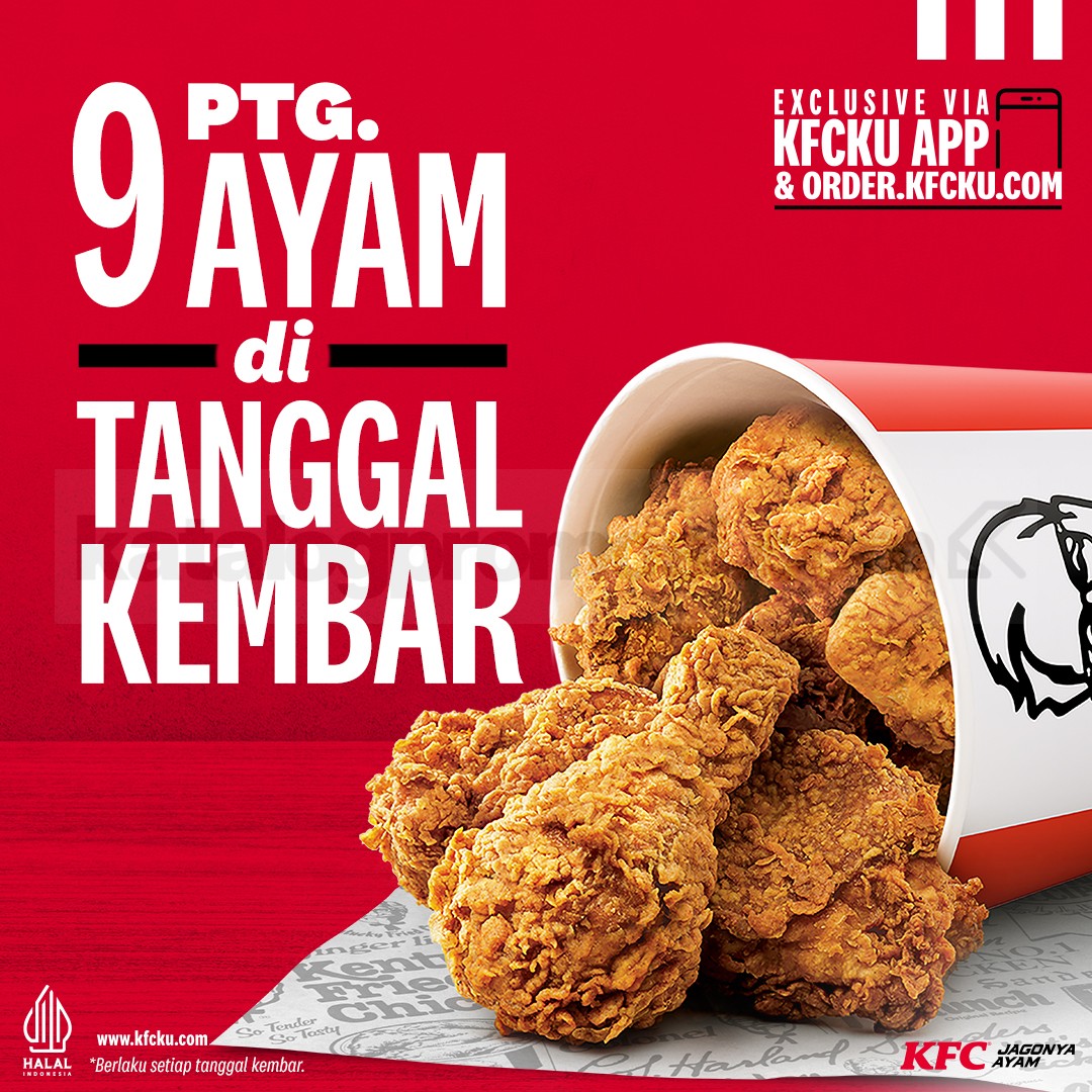 Promo KFC Tanggal Kembar cuma hari ini! Dapetin 9 ayam cuma Rp 100ribuan* di KFCku App. Buruan order sebelum promonya hilang!