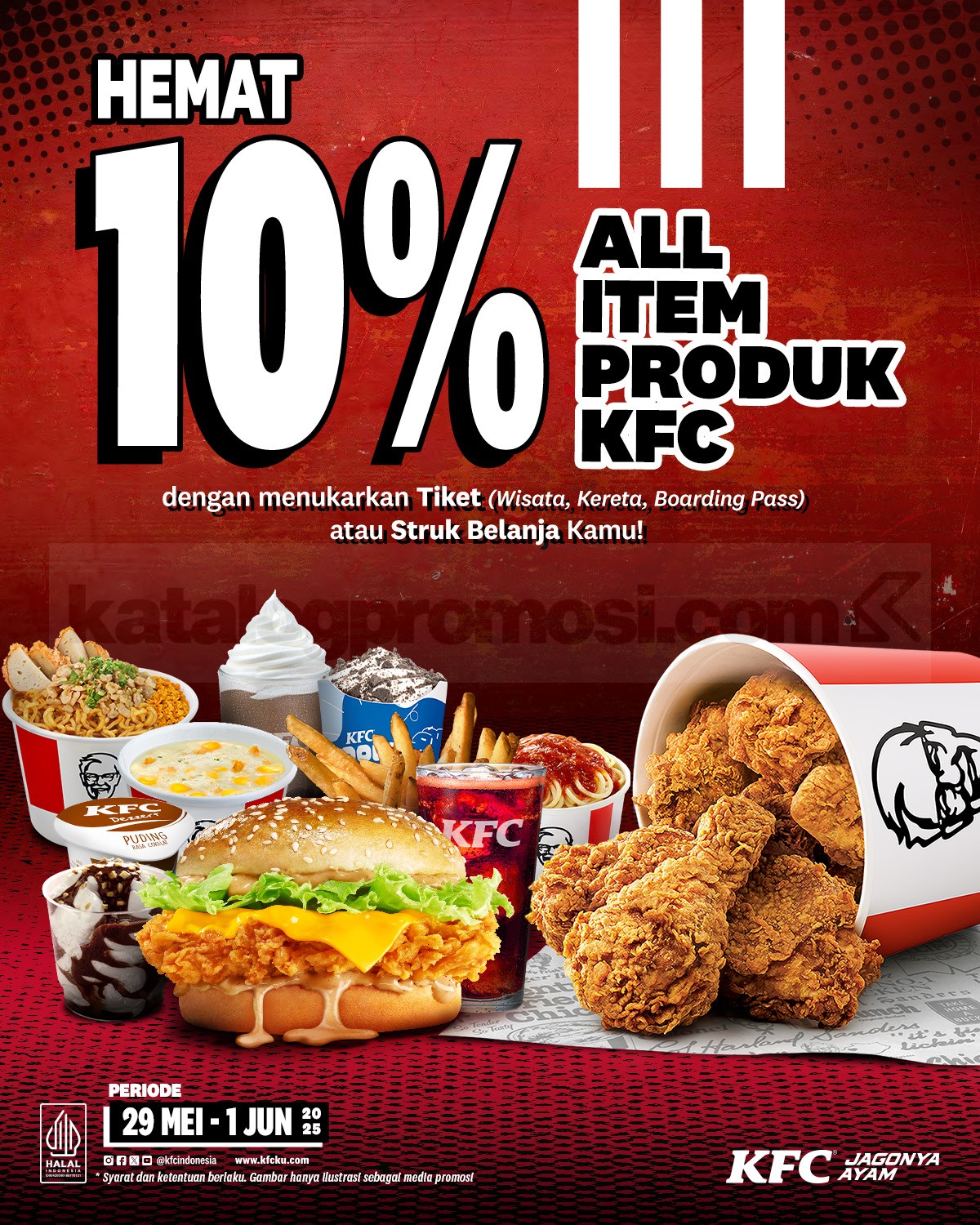 Promo KFC Diskon 10% untuk Semua Produk dengan tukar tiket atau struk belanja, berlaku mulai tanggal 29 Mei – 1 Juni 2025.