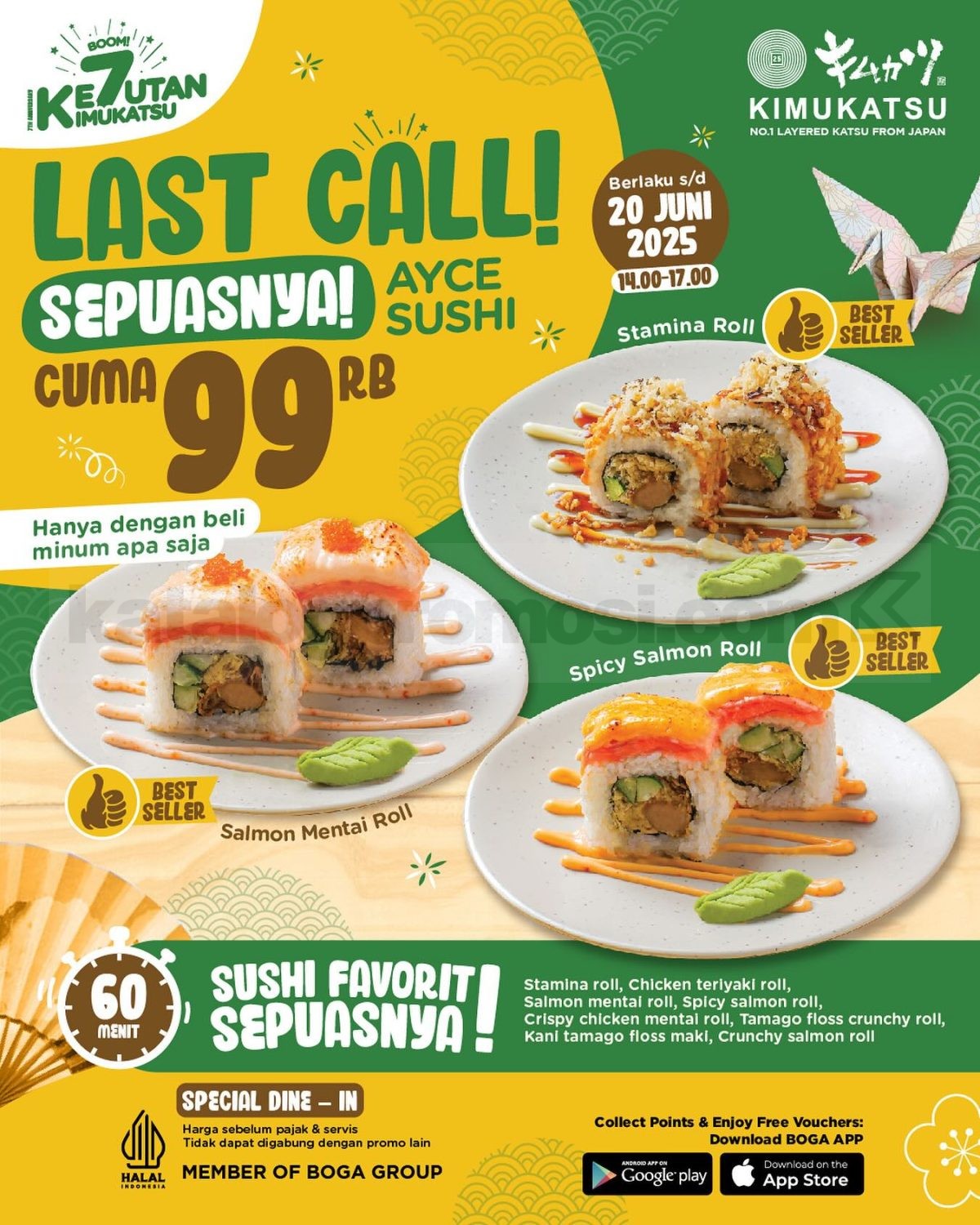 Promo Kimukatsu AYCE Sushi cuma Rp99.000 tanggal 16–20 Juni 2025! Makan sepuasnya cukup beli minuman apa aja, berlaku di seluruh outlet Kimukatsu pukul 14.00–17.00.