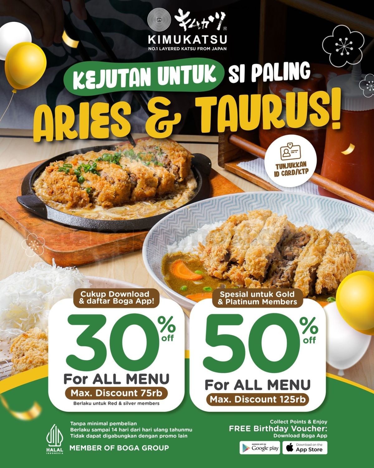 Buat kamu yang berzodiak Aries atau Taurus, ada kejutan seru dari Kimukatsu yang bikin momen ultah makin berkesan. Cukup download dan daftar di Boga App, kamu bisa menikmati berbagai menu katsu favorit dengan potongan harga yang super hemat.