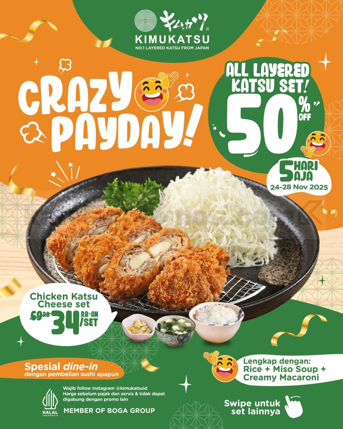 CRAZY PAYDAY! ALL LAYERED KATSU SET Diskon 50% cuman ada di Kimukatsu dan ini jadi momen terbaik buat kamu pecinta katsu berlapis. Promo Kimukatsu Crazy Payday Katsu Set Diskon 50% berlangsung lima hari, menawarkan potongan harga besar untuk semua Katsu Set lengkap dengan nasi, miso soup, dan creamy macaroni โ pas banget buat makan enak tanpa takut kantong terkuras.