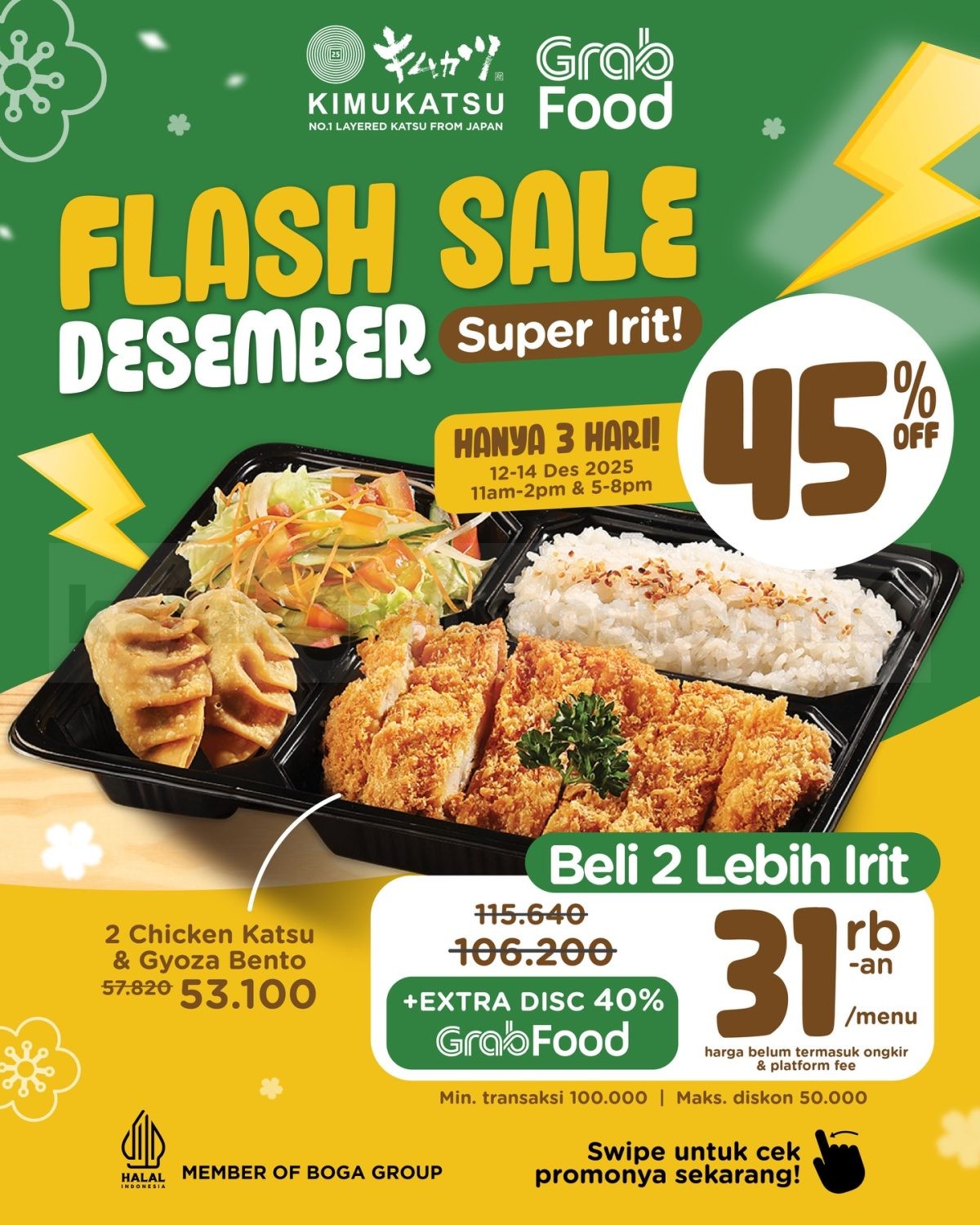 Promo Kimukatsu Flash Sale Desember Diskon 45% untuk paket 2 Chicken Katsu & Gyoza Bento dengan ekstra diskon GrabFood, berlaku mulai tanggal 12 – 14 Desember 2025.