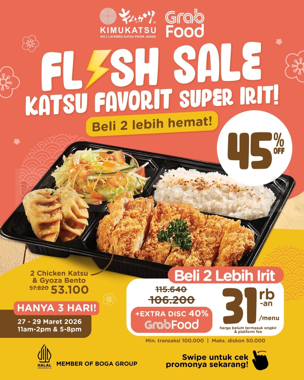 Promo Kimukatsu GrabFood Flash Sale Diskon 45% dengan harga Rp. 31 ribu-an/menu plus ekstra diskon berlaku 27 Maret 2026 – 29 Maret 2026.