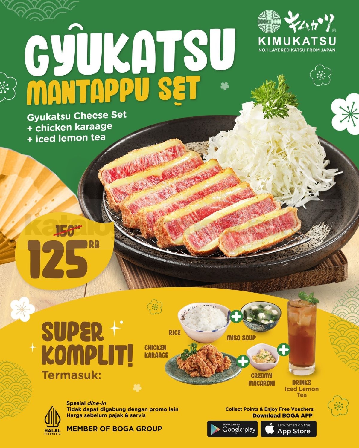 Promo Kimukatsu Gyukatsu Mantappu Set Rp. 125.000 paket lengkap Gyukatsu Cheese Set + karaage + minum berlaku selama periode promo berlangsung di seluruh outlet.