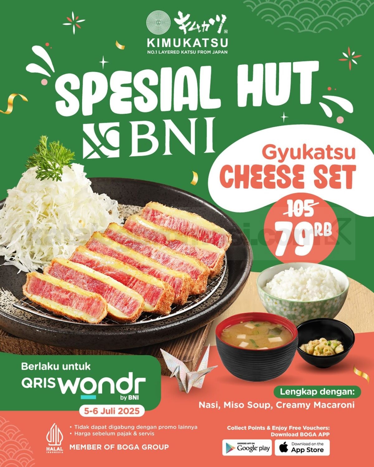 Pencinta gyukatsu, waktunya serbu promo spesial ulang tahun ke-79 BNI di Kimukatsu! Selama periode 5-6 Juli 2025, cukup transaksi pakai QRIS wondr by BNI, kamu bisa nikmatin Gyukatsu Cheese Set cuma Rp79.000 dari harga normal Rp105.000.