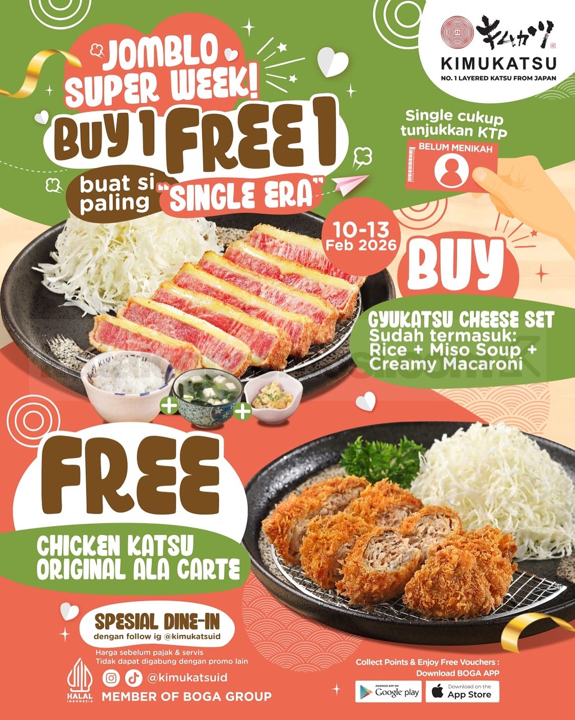 Promo Kimukatsu Jomblo Super Week Buy 1 Get 1 Free Gyukatsu Cheese Set dan Chicken Katsu berlaku 10 – 13 Februari 2026 khusus dine-in.