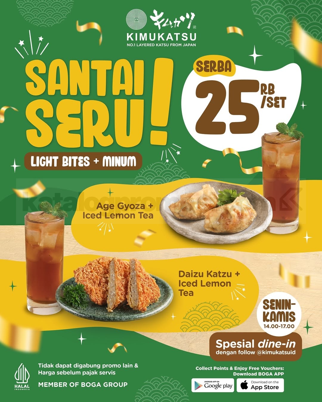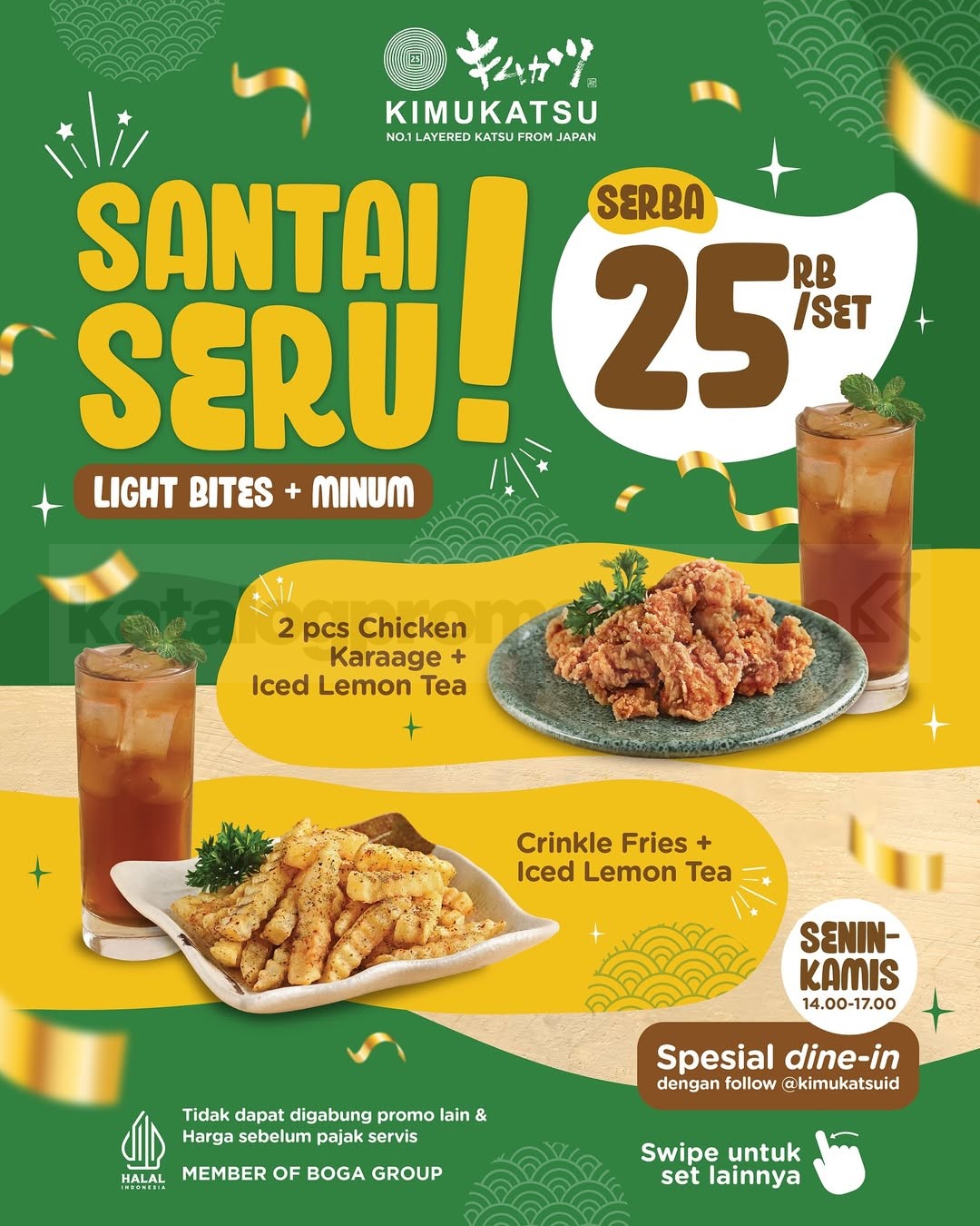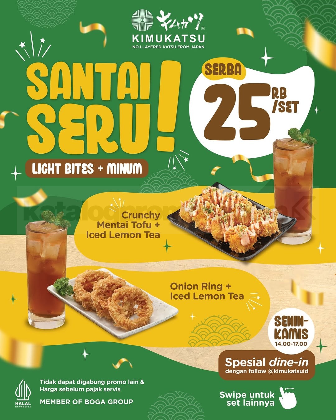 Promo Kimukatsu Santai Seru Rp25.000 per set dengan pilihan light bites + minum, berlaku SeninโKamis pukul 14.00โ17.00 khusus dine-in di semua outlet.